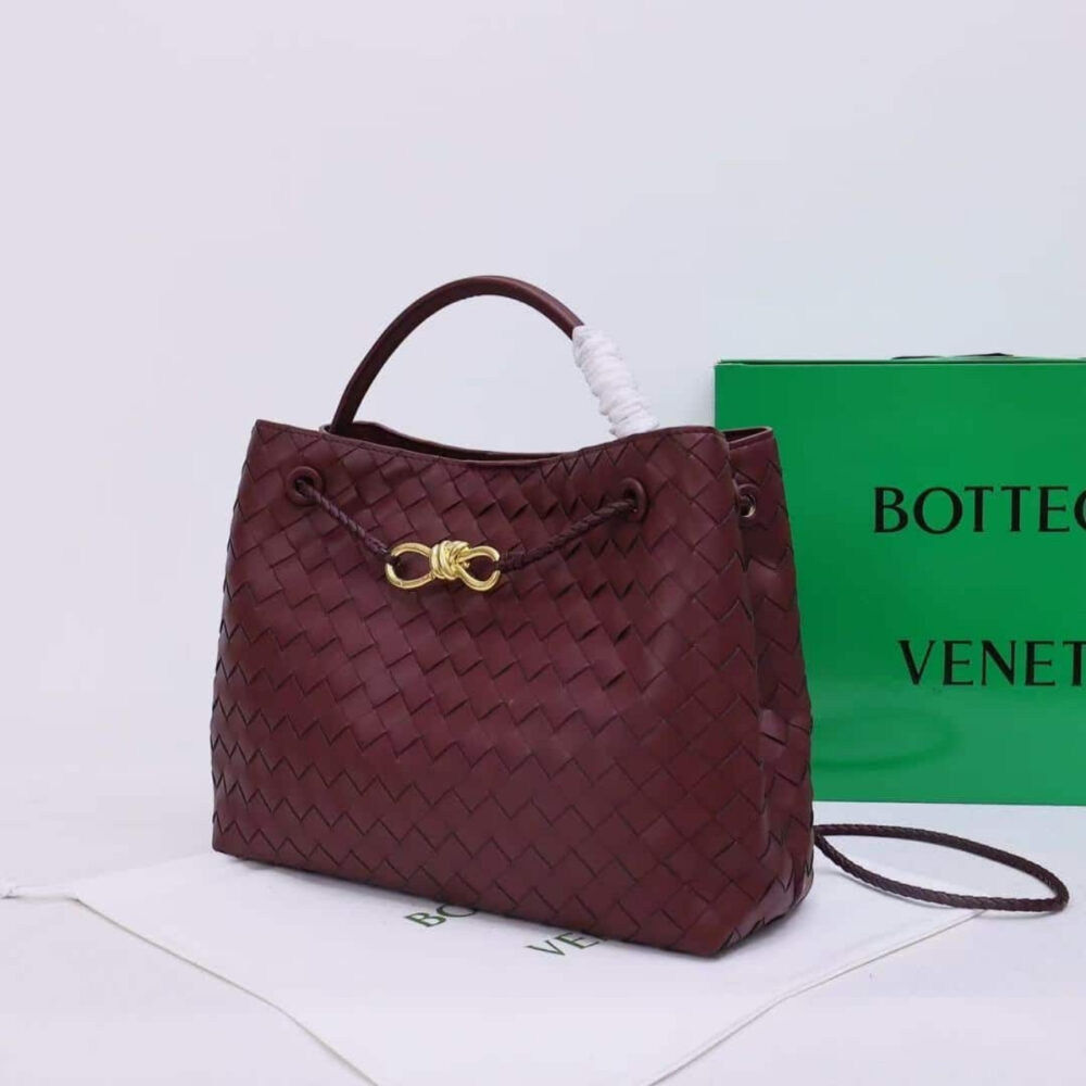 The Bottega Veneta Andiamo Bag in Burgundy showcases woven leather in a spacious, structured silhouette. Featuring a top handle and an adjustable shoulder strap, it’s designed for both elegance and versatility. The knotted metal detail adds a signature touch, making it a timeless piece for refined everyday use.
