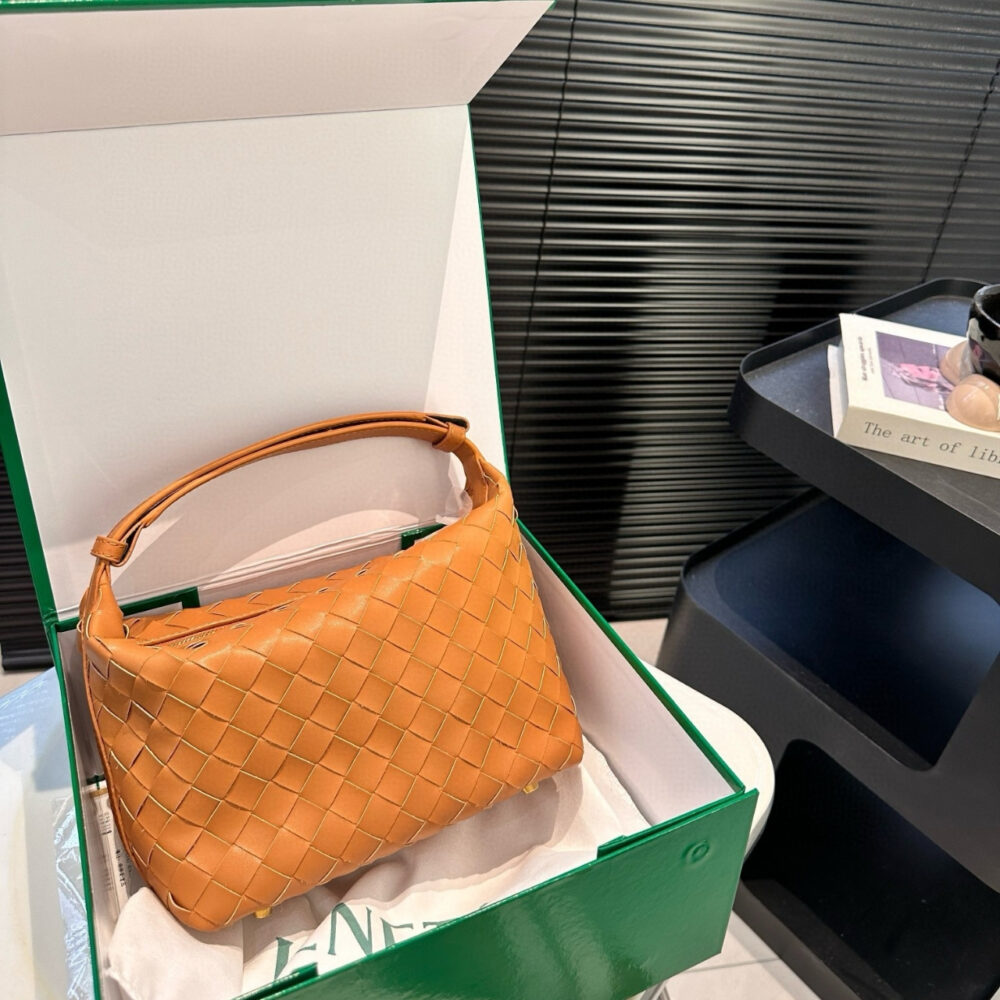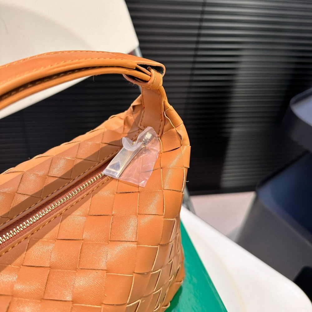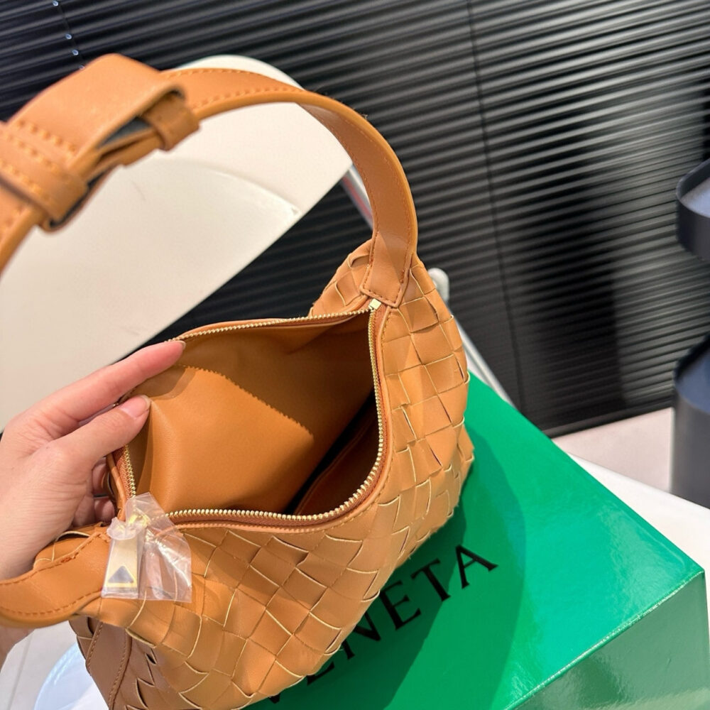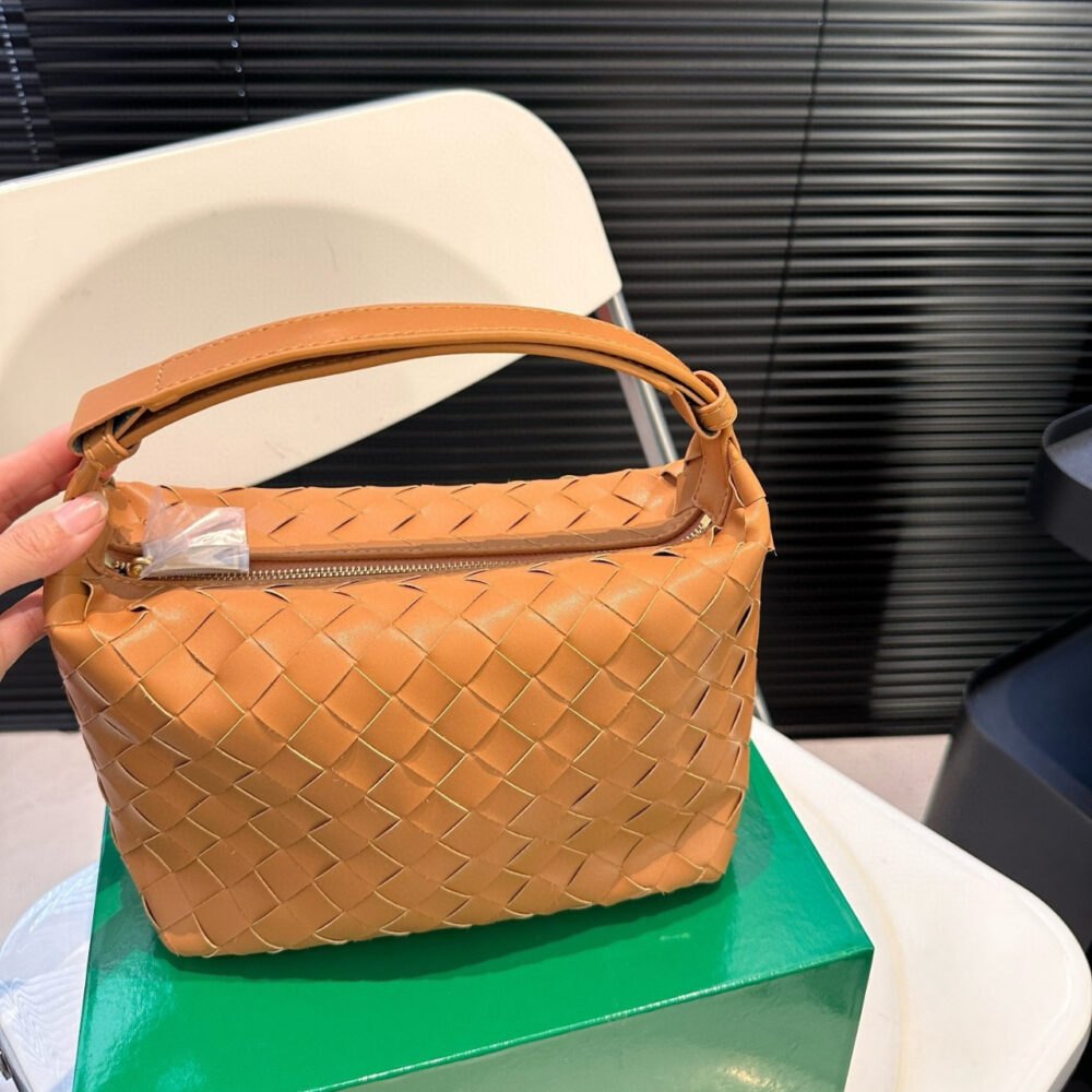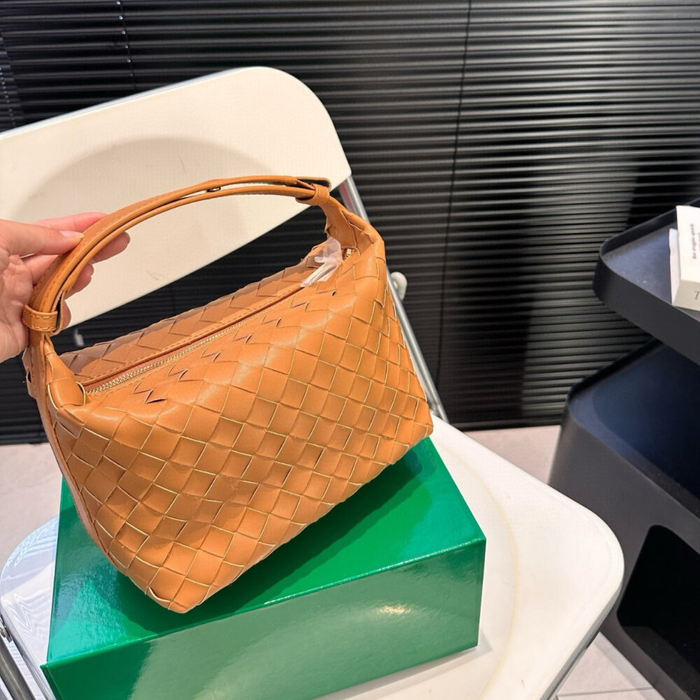 This is a Bottega Veneta handbag featuring the brand’s iconic design. It comes in a warm caramel shade with a top handle and a zip closure for practicality. The minimalistic yet elegant style makes it a versatile accessory for everyday use.