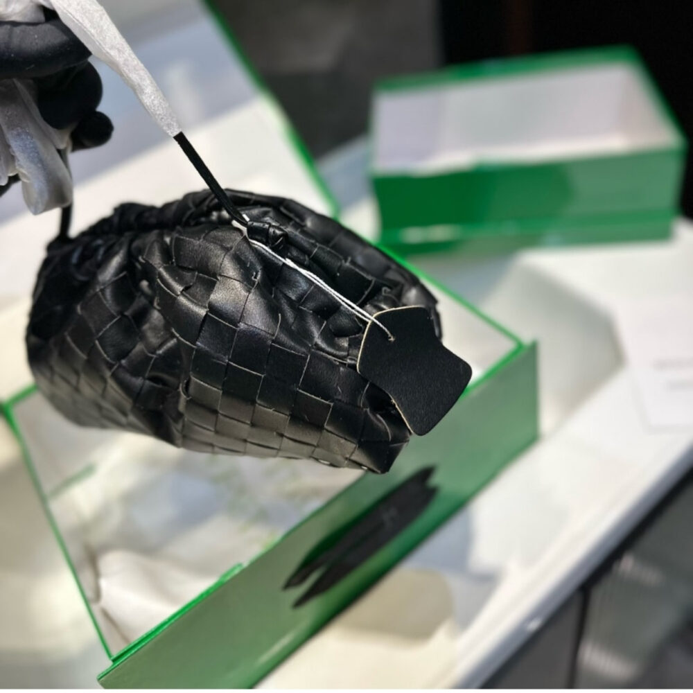 The Mini Pouch in black showcases Bottega Veneta’s refined Intrecciato craftsmanship in a compact 20cm silhouette. Its softly structured form and drawstring closure exude effortless elegance, ideal for both casual and dressy occasions.