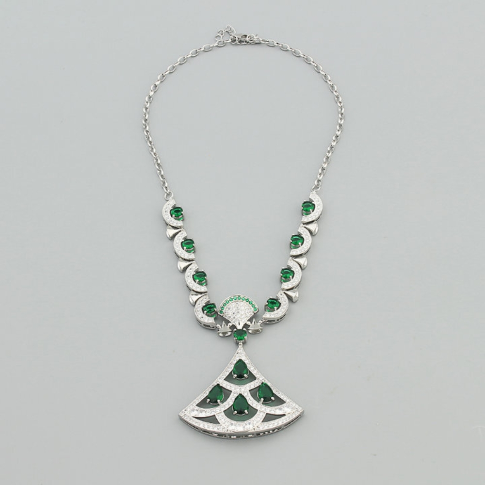 This is a white gold necklace featuring an ornate design set with green stone. The upper chain is accented with crescent-shaped links, each holding a green stone, leading to a fan-shaped pendant. Its combination of white gold and rich green creates a bold, luxurious, and elegant statement piece.