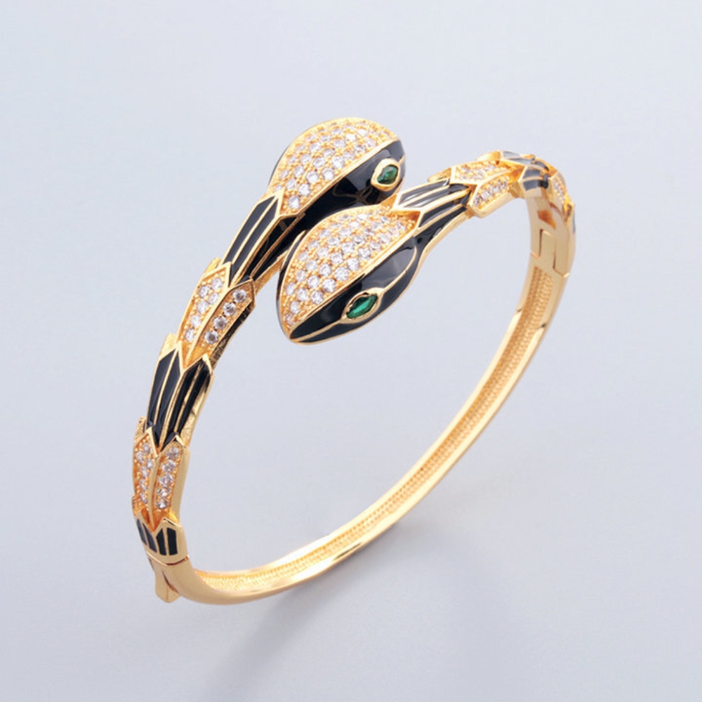 It features the signature double-headed snake design, symbolizing seduction and rebirth. The bracelet is crafted in yellow gold with black enamel detailing, pavรฉ-set diamonds, and green gemstone eyes. Itโs an iconic high-jewelry piece that embodies Bvlgariโs luxurious and bold aesthetic.