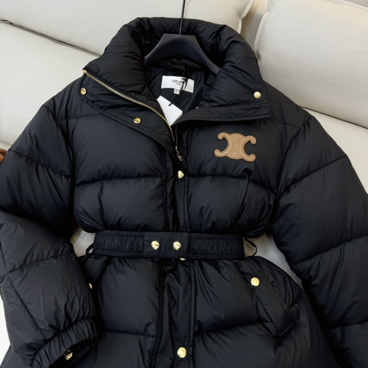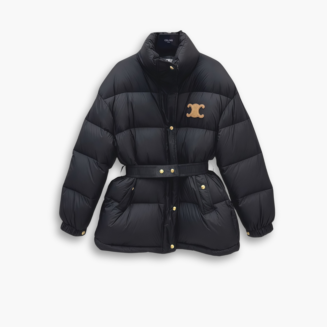 An elegant yet functional outerwear piece, this Celine down jacket is crafted from premium black polyester for a smooth, lightweight finish. The design features a belted waist that enhances the silhouette black maintaining a cozy, voluminous shape. Detailed with gold-tone snap buttons and the signature Triomphe logo on the chest, it perfectly combines modern luxury with timeless sophistication.