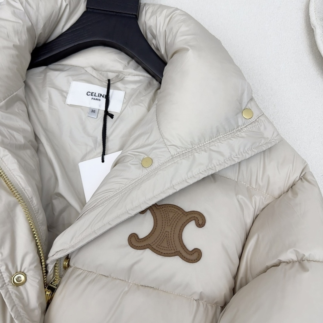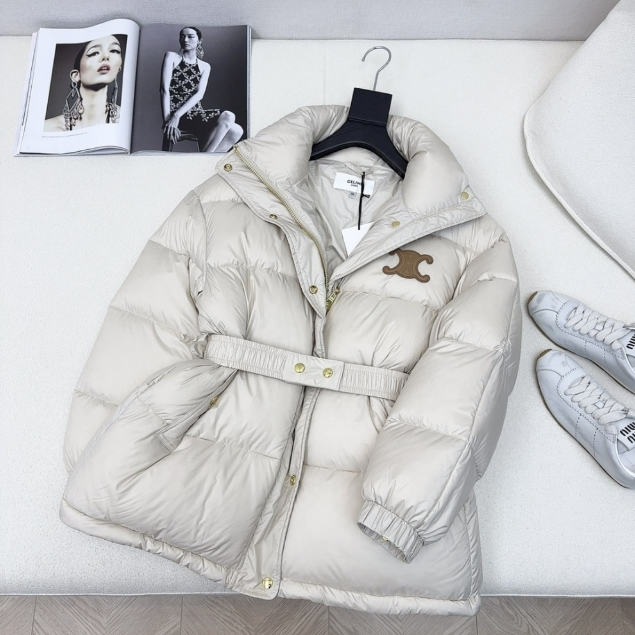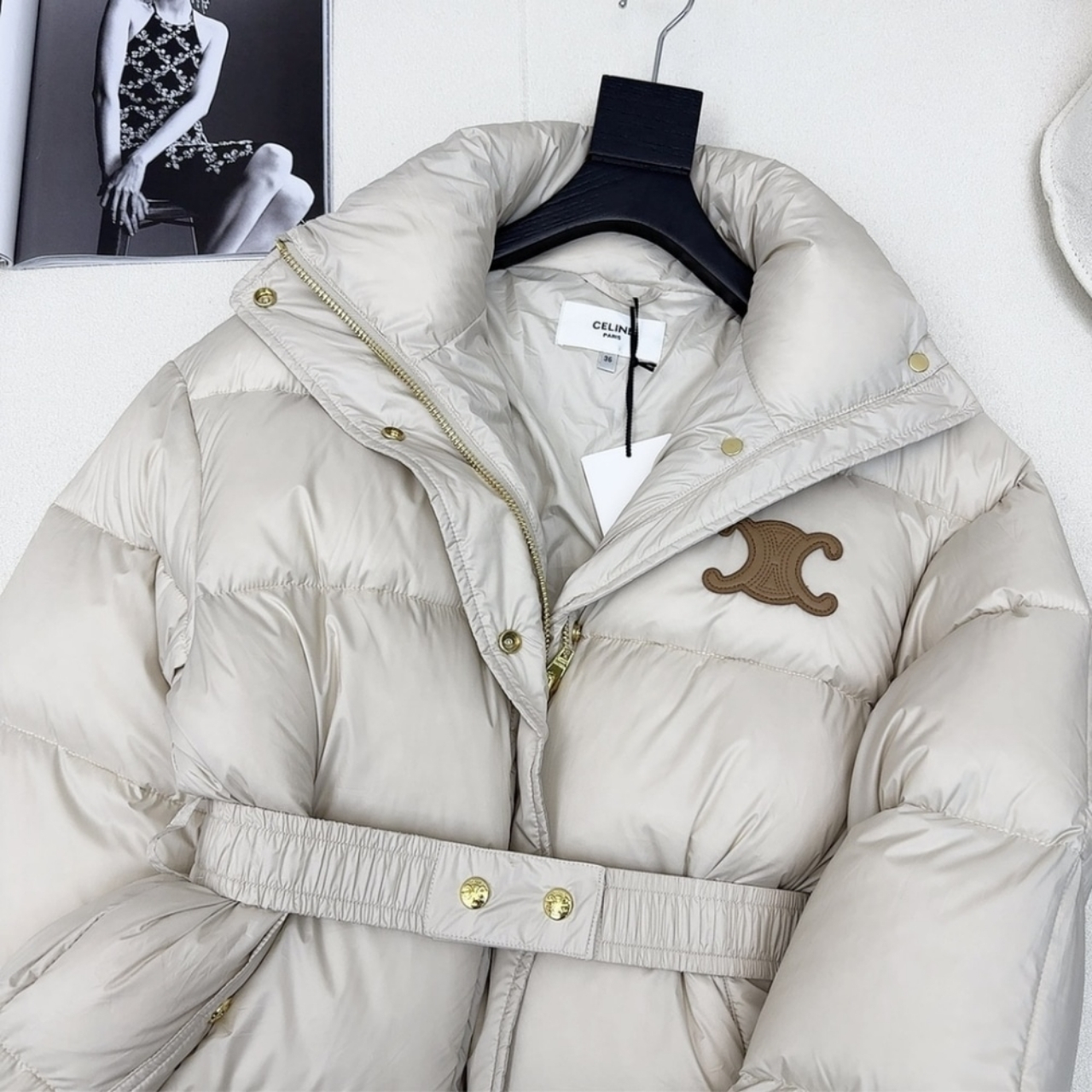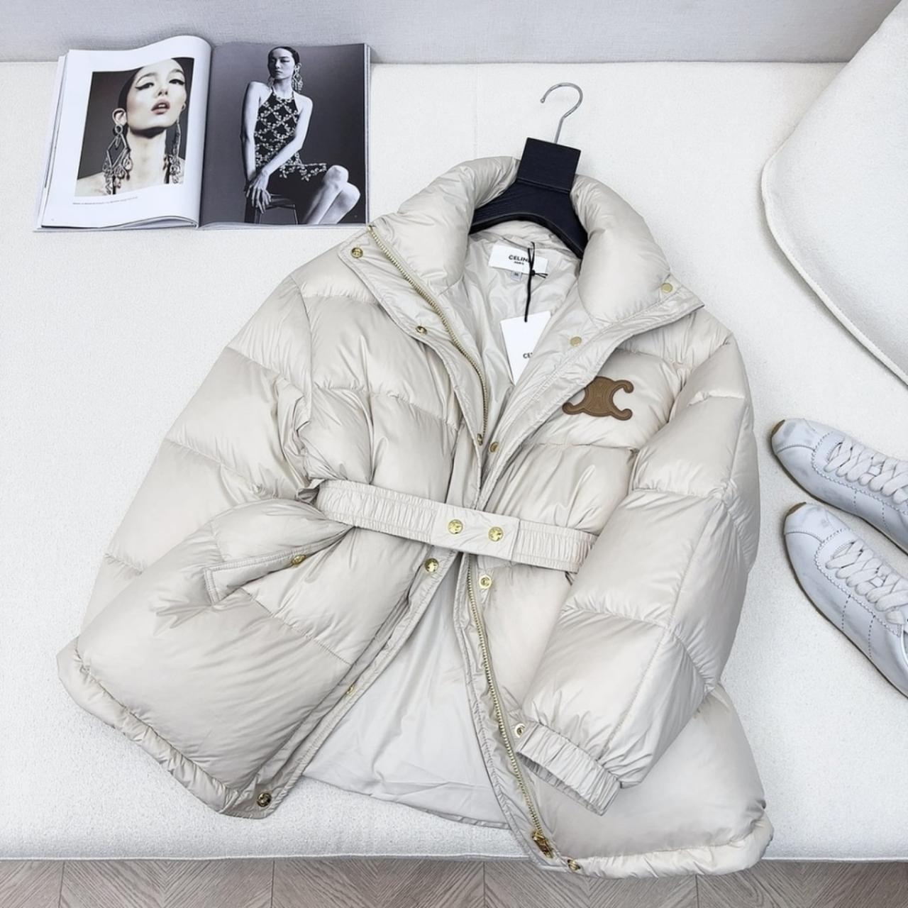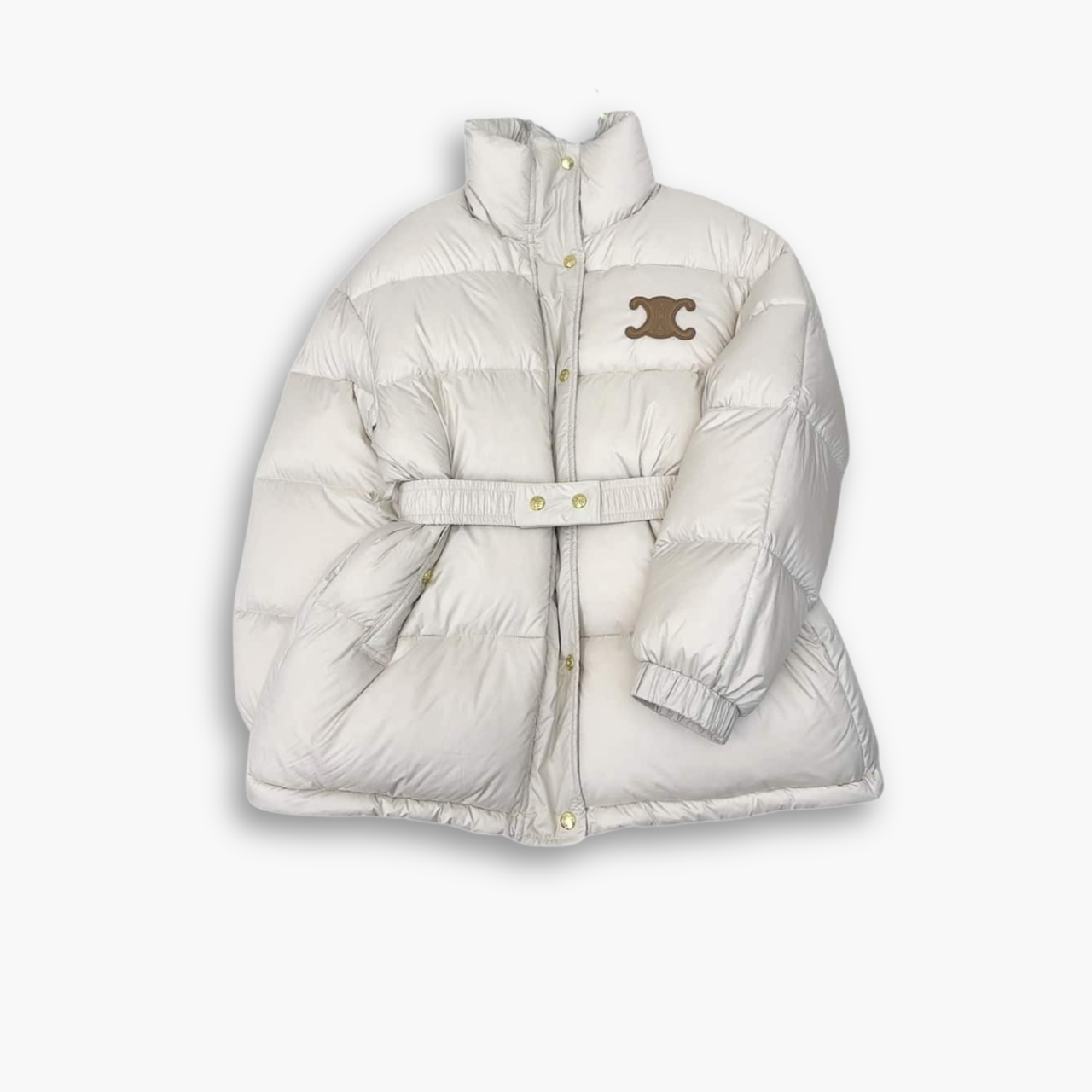 An elegant yet functional outerwear piece, this Celine down jacket is crafted from premium white polyester for a smooth, lightweight finish. The design features a belted waist that enhances the silhouette while maintaining a cozy, voluminous shape. Detailed with gold-tone snap buttons and the signature Triomphe logo on the chest, it perfectly combines modern luxury with timeless sophistication.