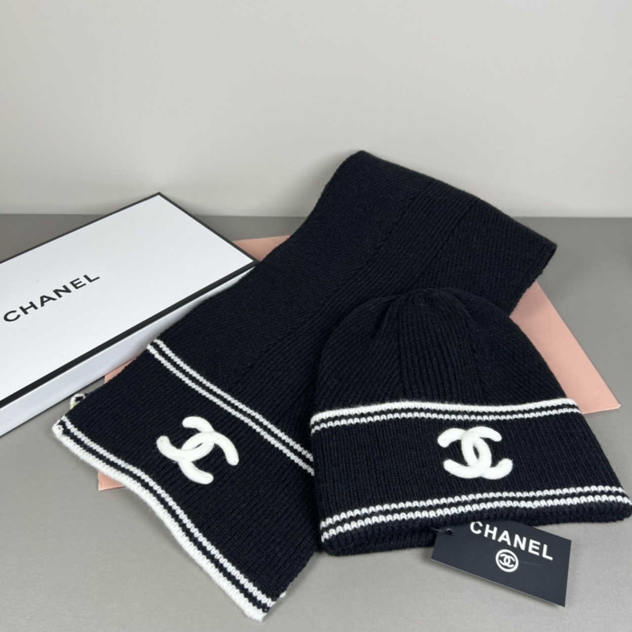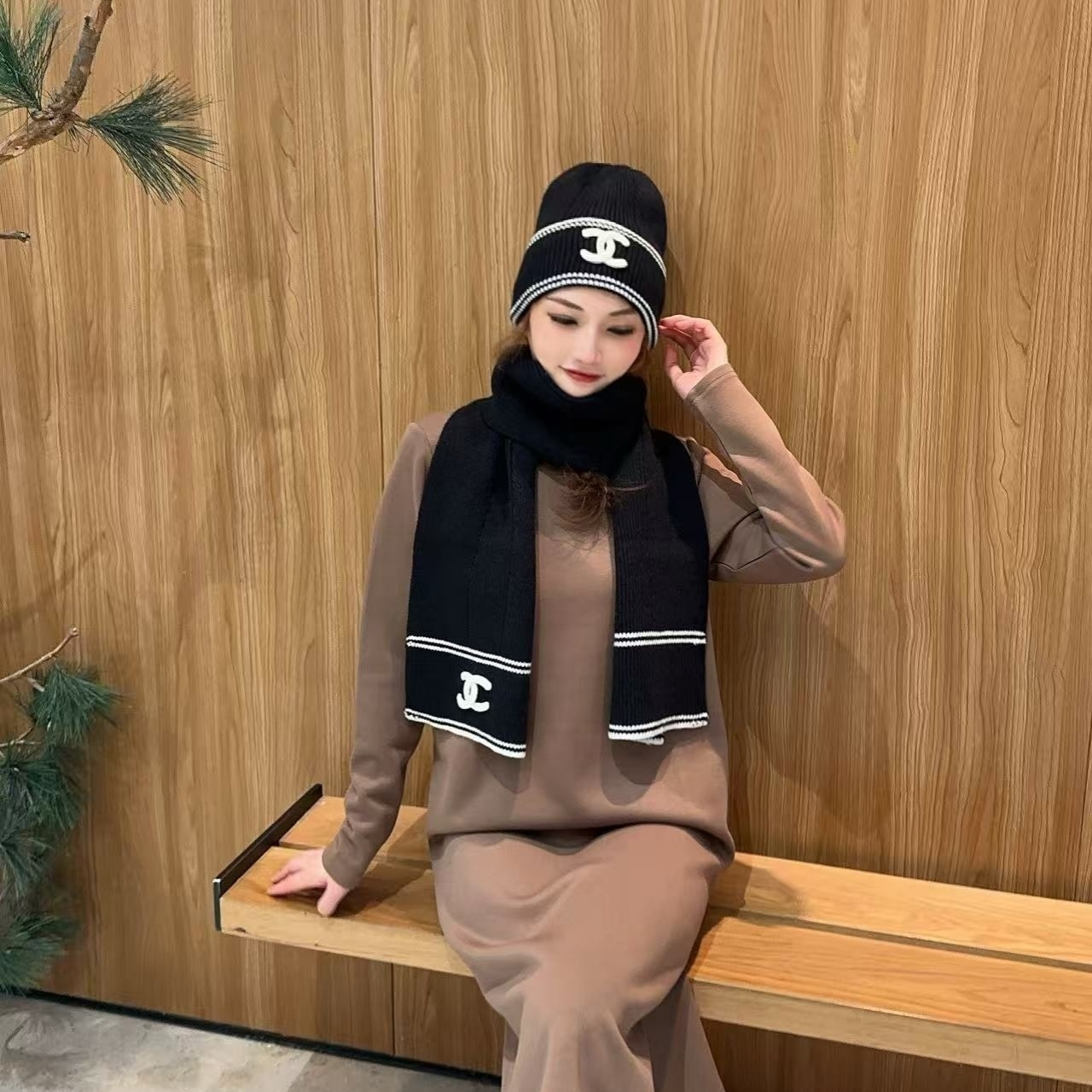 Replica 1:1 – Chanel 23B CC Logo Beanie And Scarf Black Wool Set