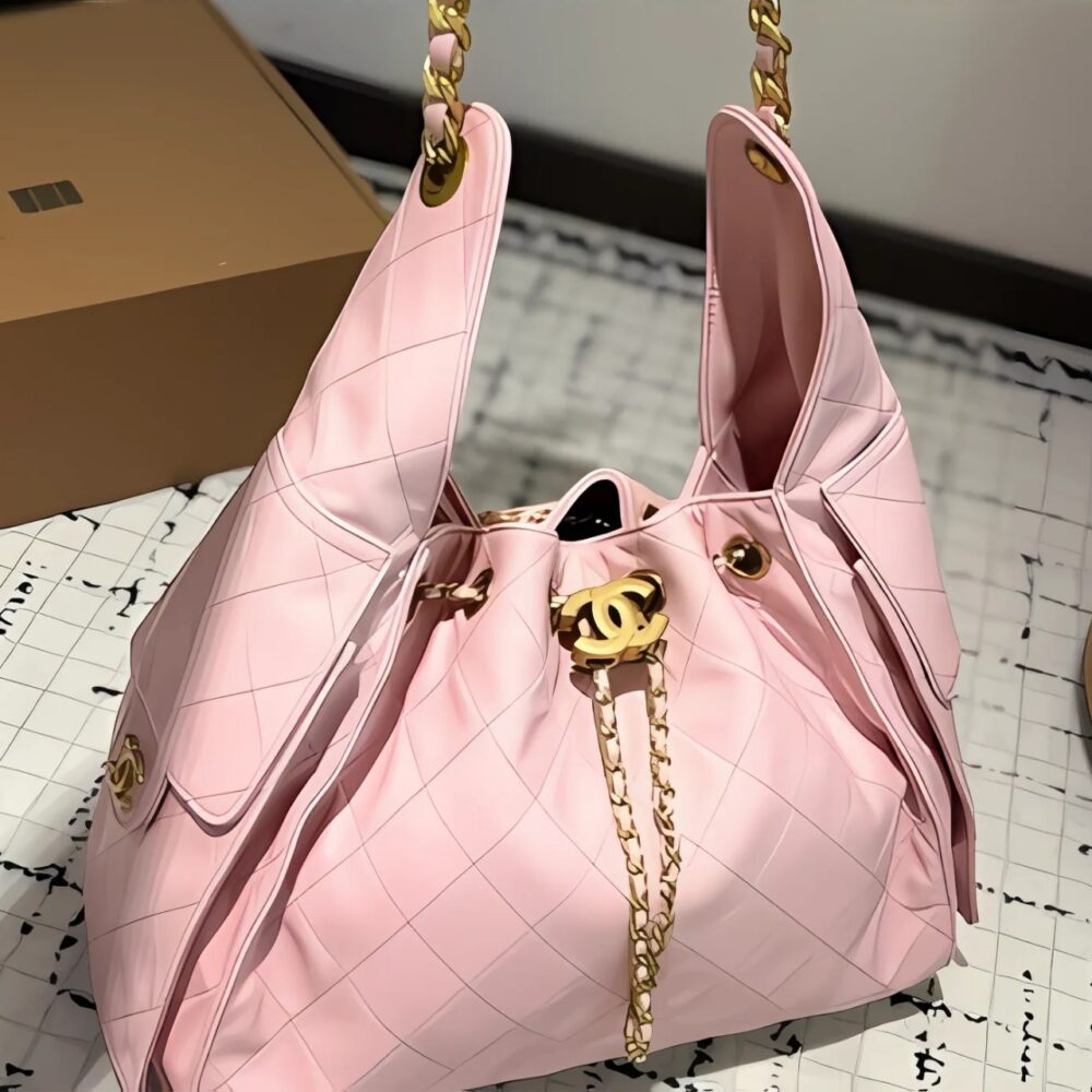 The Chanel 25 Small Handbag in pink grained leather features luxurious gold-tone metal details. With its 30cm size, this handbag provides an elegant yet practical design for everyday use. Its soft pink color and iconic style make it a perfect addition to any wardrobe.