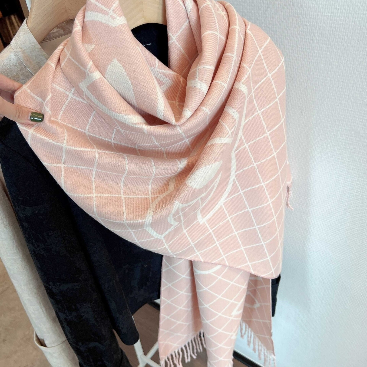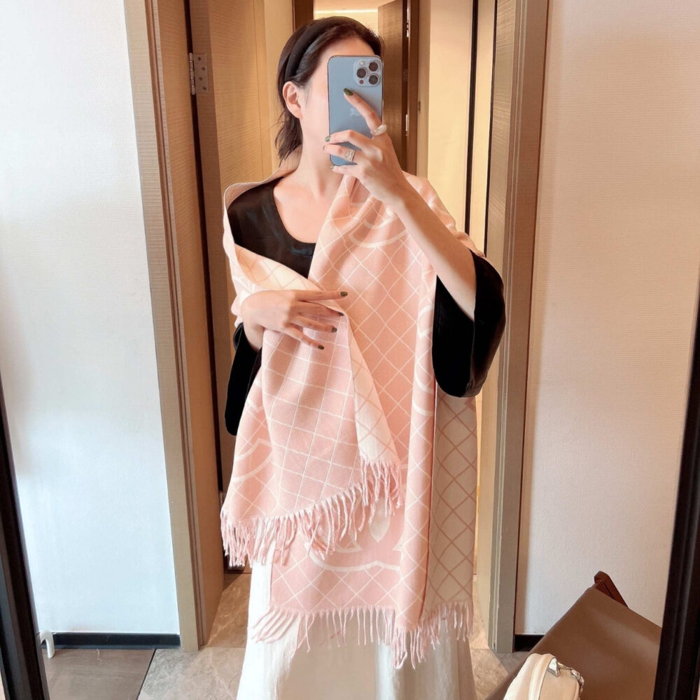 Delicate and refined, this Chanel scarf features the iconic diamond quilting pattern interlaced with oversized CC logos, a nod to the Maison’s timeless elegance. Crafted from a soft, lightweight blend, it drapes beautifully — perfect for layering through any season. The blush pink tone brings a subtle, feminine charm to your look.
