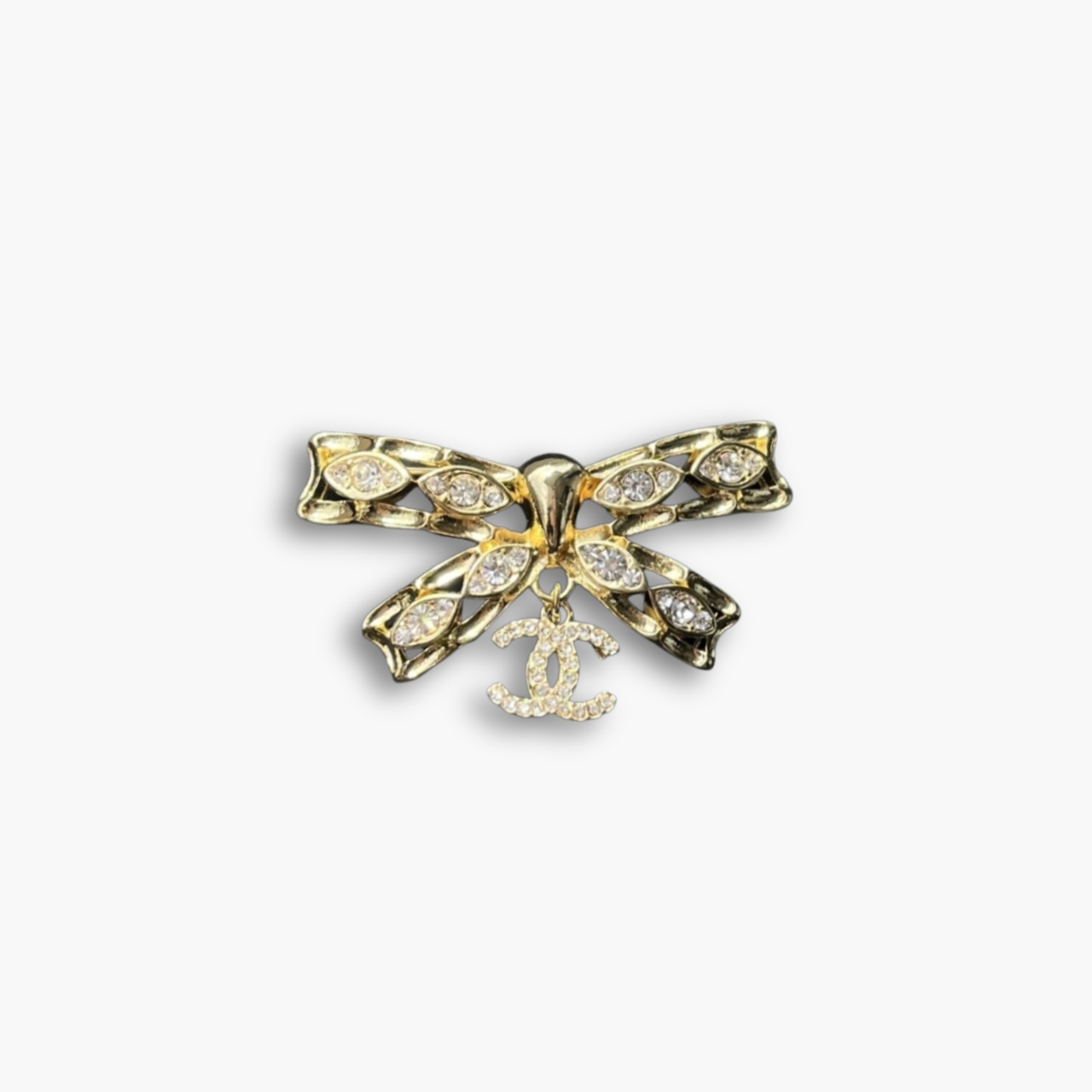 This brooch is extremely attractive for its delicate, feminine bow shape, which features an intricate gold-tone openwork design inlaid with brilliant marquise-cut crystals. The addition of a small, shimmering dangling CC charm adds playful movement and instantly identifies the piece as a luxurious and elegant accessory.