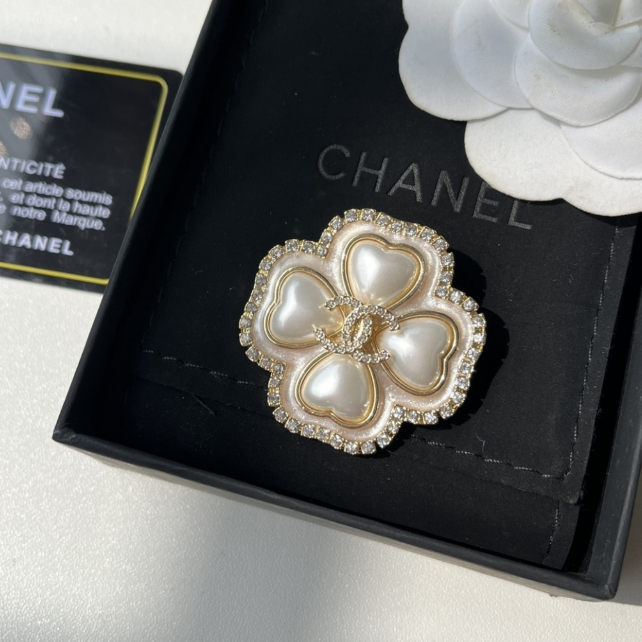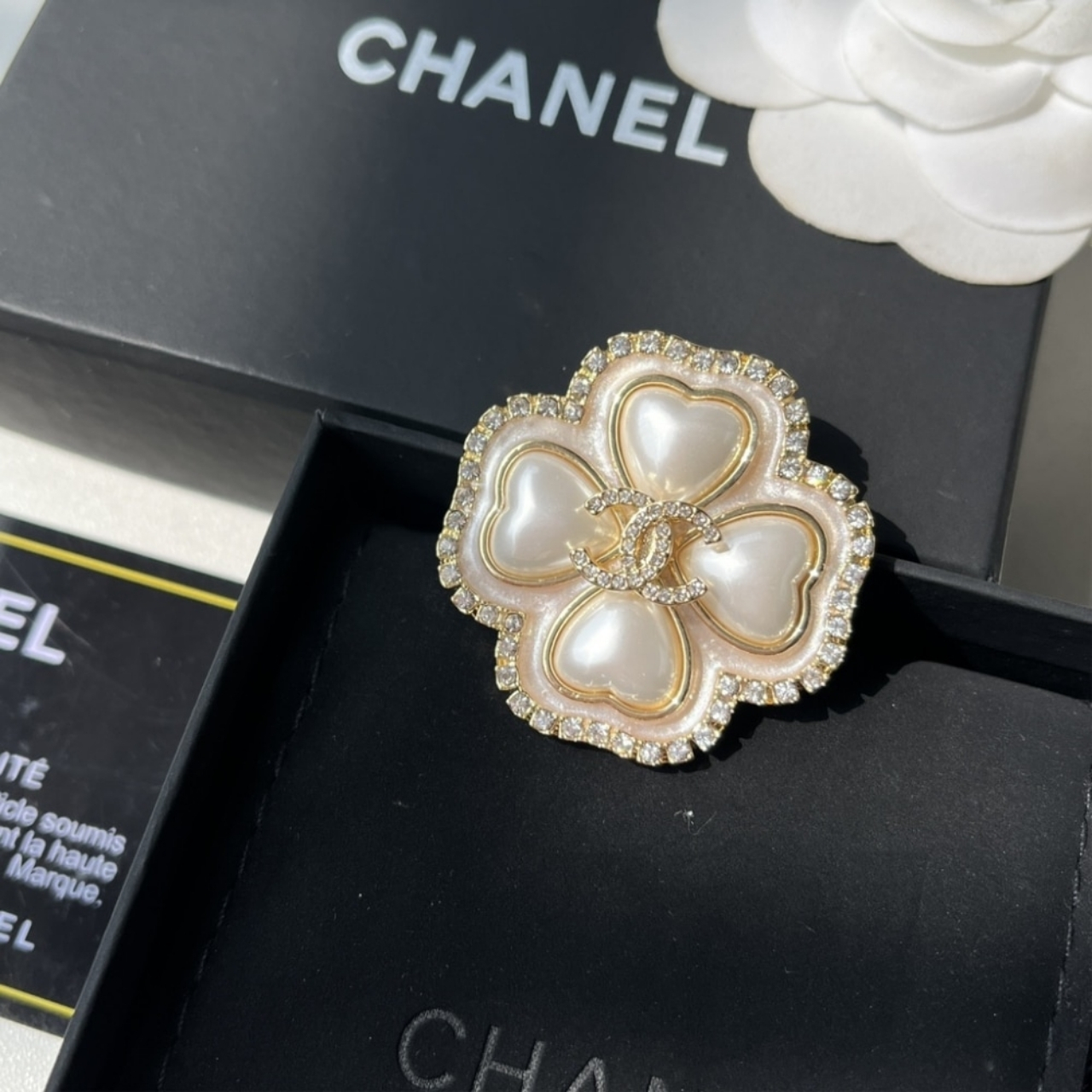 This brooch is exceptionally attractive due to its soft yet opulent design, centering on the romantic Camellia flower, a key symbol of the brand, rendered in luminous, pearlescent petals. The classic elegance is amplified by the brilliant frame of crystals surrounding the flower’s edge and the dazzling micro CC logo nestled at its heart, creating a stunning piece that symbolizes purity and luxury.