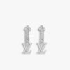 These are Chanel earrings featuring the iconic interlocking “CC” logo, fully embellished with sparkling crystals. Each earring is accented with a dangling white pearl, adding a touch of elegance and timeless sophistication. A chic accessory that perfectly blends classic Chanel style with modern glamour.