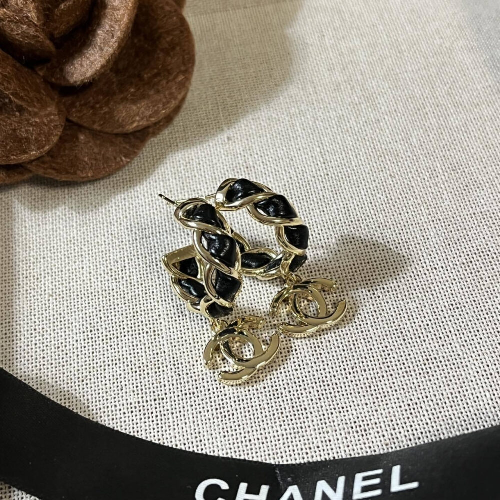 The hoops are designed with a gold and black intertwined chain, creating a bold yet elegant look. Hanging from each hoop is the signature interlocking CC charm in gold, adding a timeless Chanel touch.
