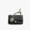 This Chanel mini flap bag has dark brown with gold-tone hardware. It features the iconic CC turn-lock closure and a chic chain handle. A pearl and crystal heart charm adds a touch of elegance and playfulness.