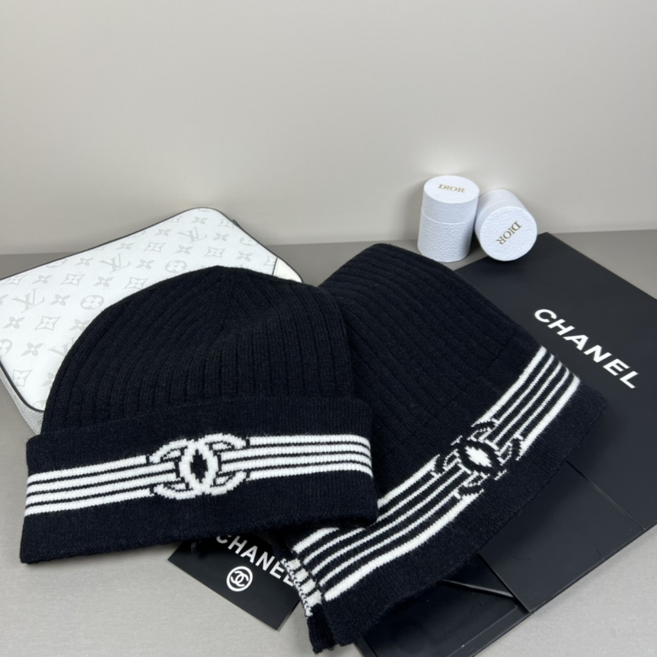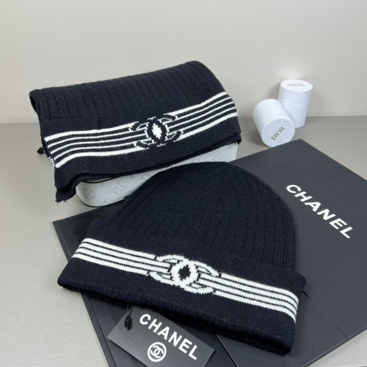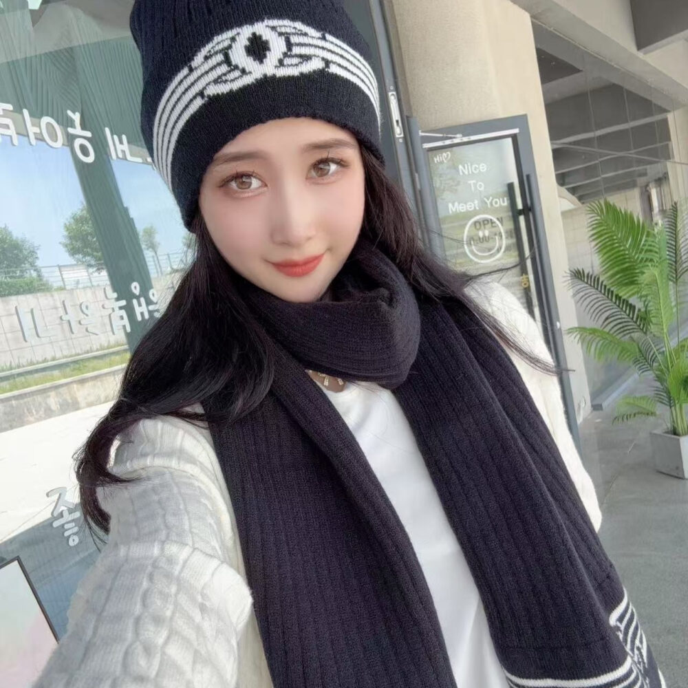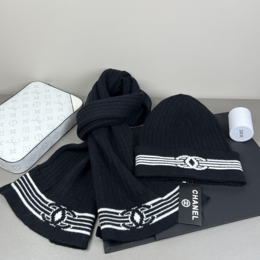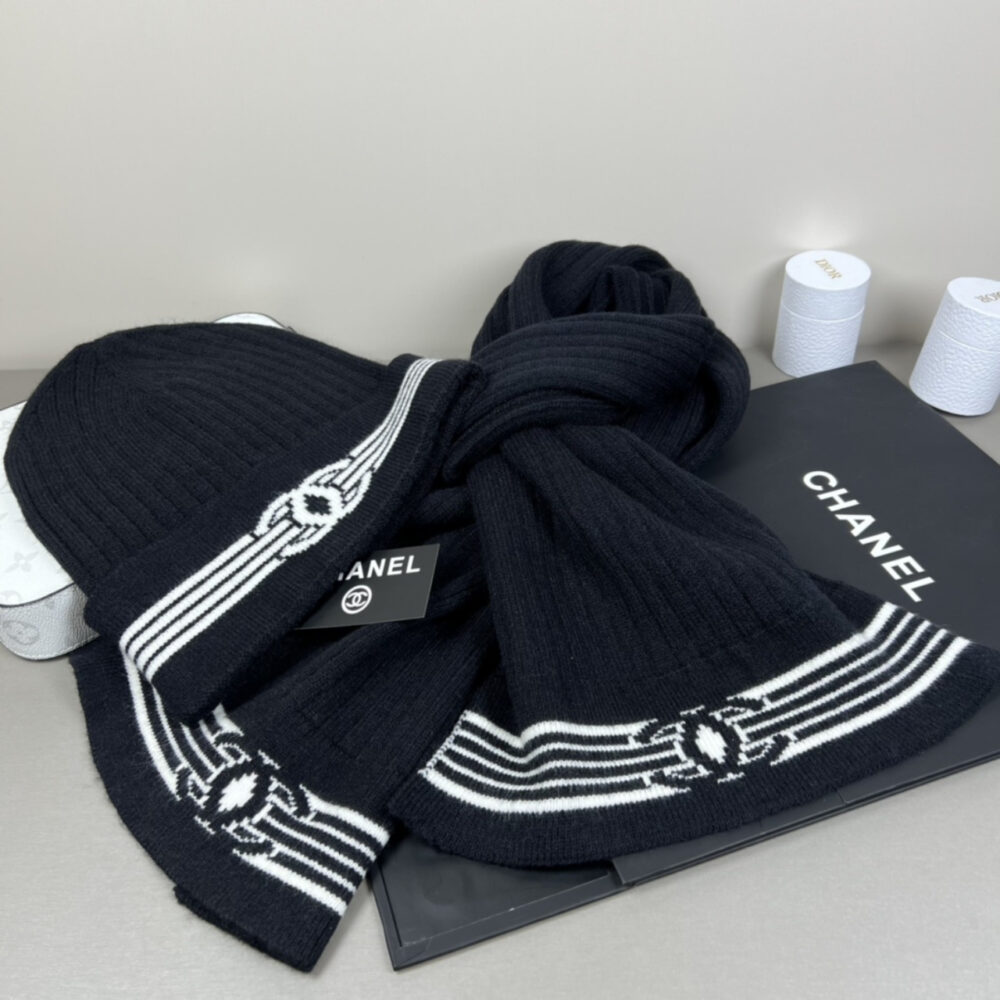Replica 1:1 – Chanel Knit Beanie And Scarf Black Wool Set