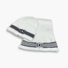 This set is exceptionally attractive for its chic, nautical-inspired contrast, using a pure black ribbed knit with bold, clean white stripes for a timelessly graphic appeal. The centrally placed black-on-white CC logo on both pieces provides sophisticated brand recognition, perfectly fusing cozy texture with classic luxury styling.