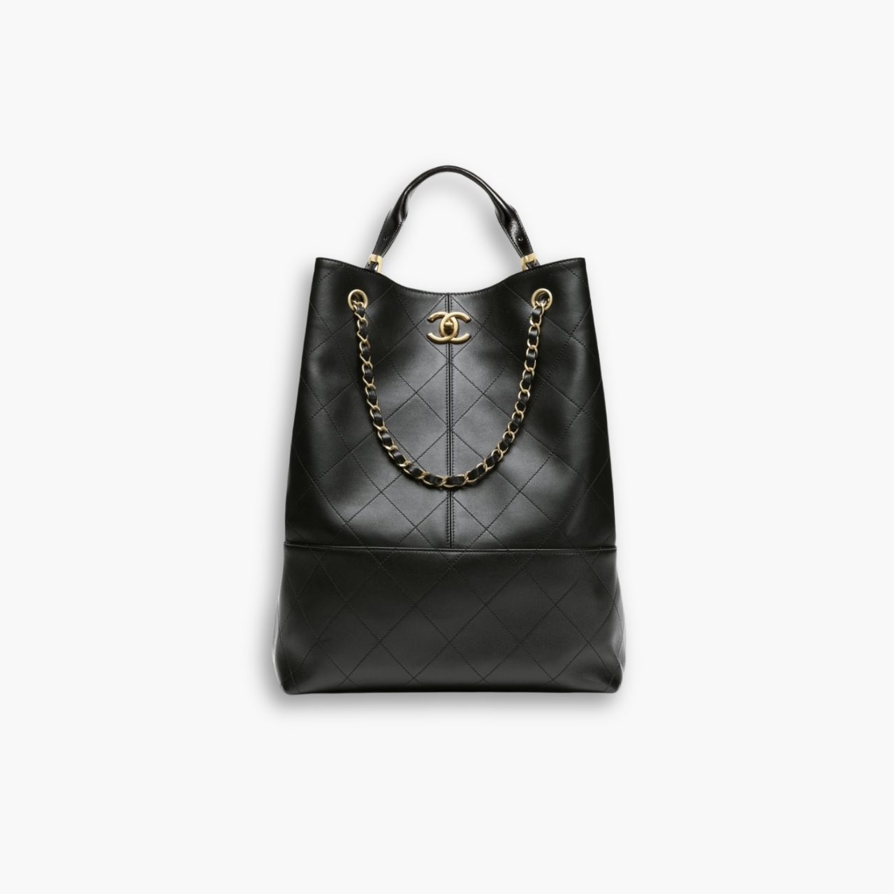 This is a Chanel bag in black, featuring the iconic diamond pattern and gold-tone CC logo. It has a chain-and-leather strap detail along with a sturdy top handle, blending elegance with practicality. Spacious and stylish, it’s a versatile piece perfect for both casual and chic occasions.