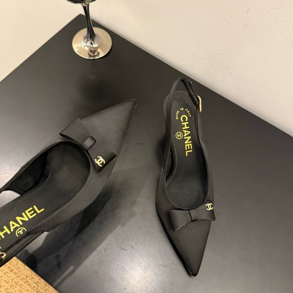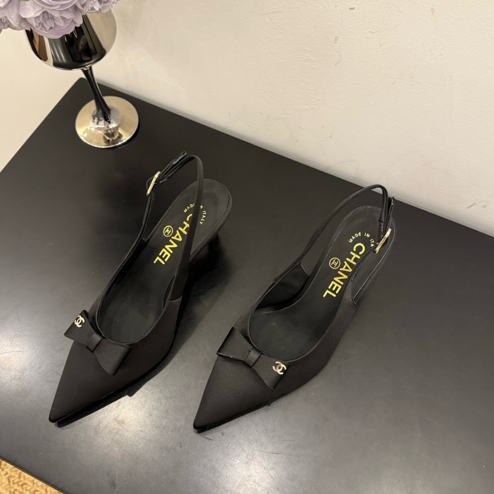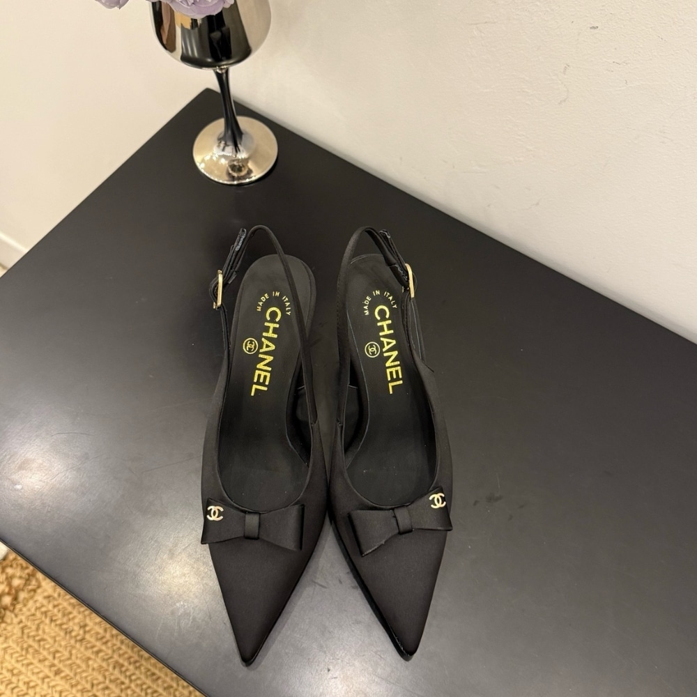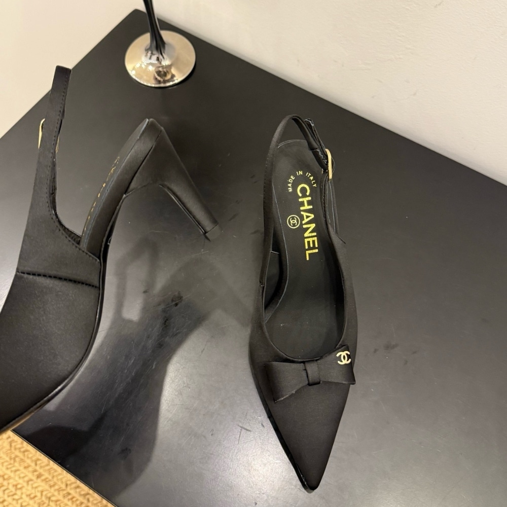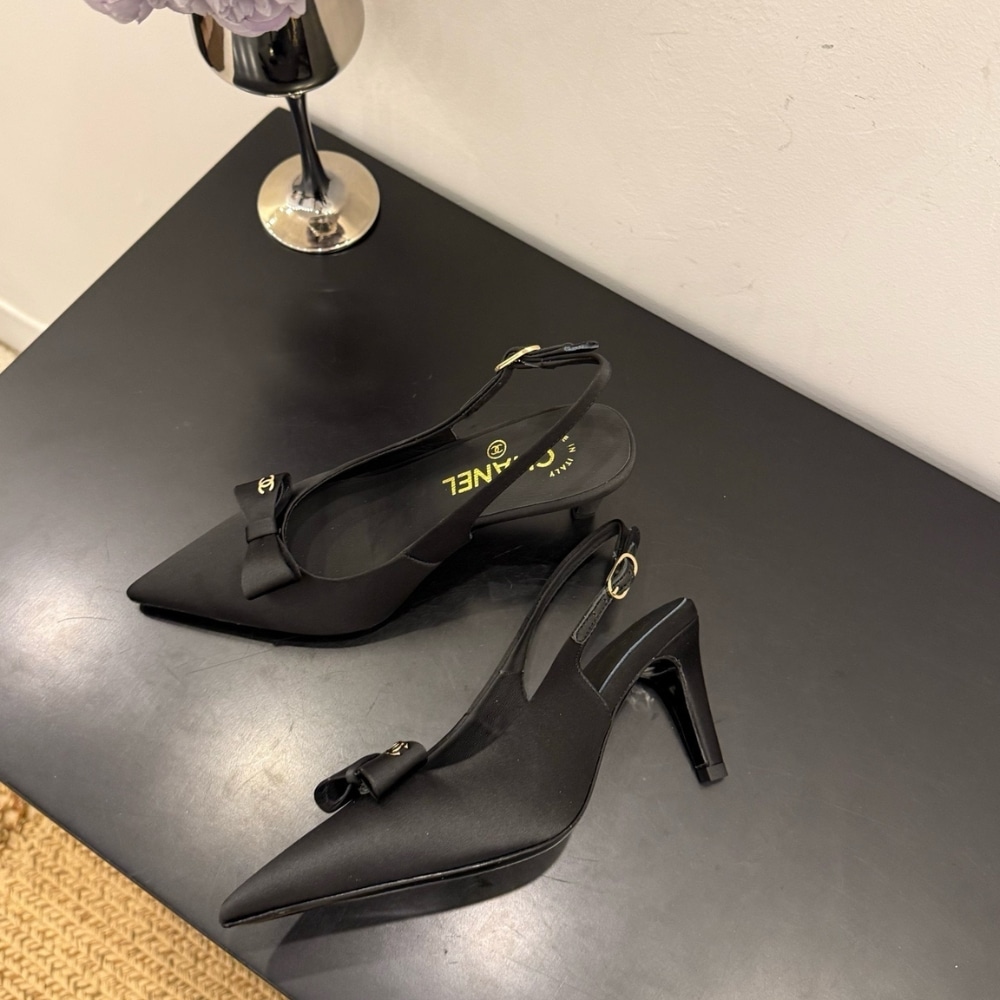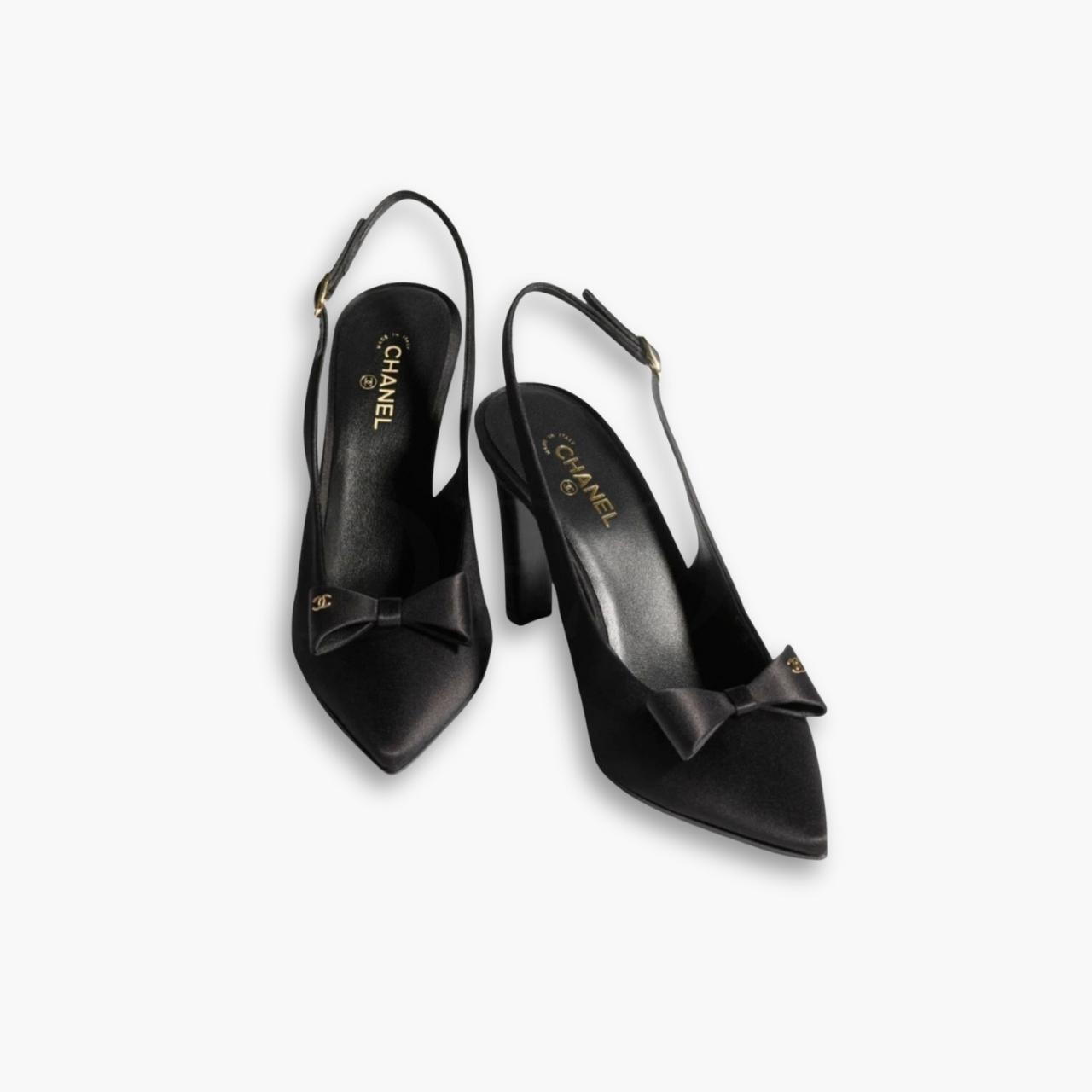 These Chanel slingback high heels feature a sleek pointed toe and elegant black satin finish, embodying timeless sophistication. The subtle bow detail adorned with the iconic CC logo adds a feminine charm. Perfect for evening wear or refined occasions, they offer both elegance and allure in every step.