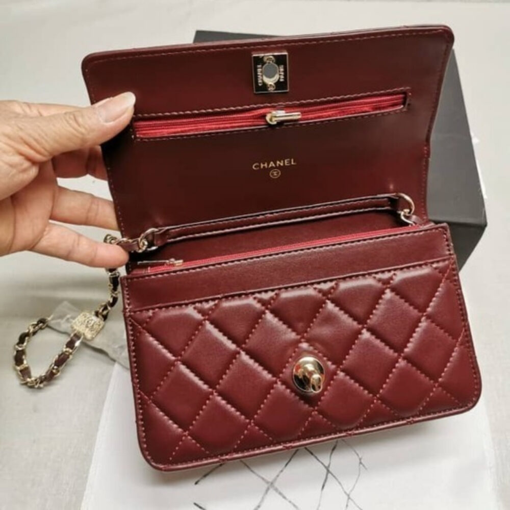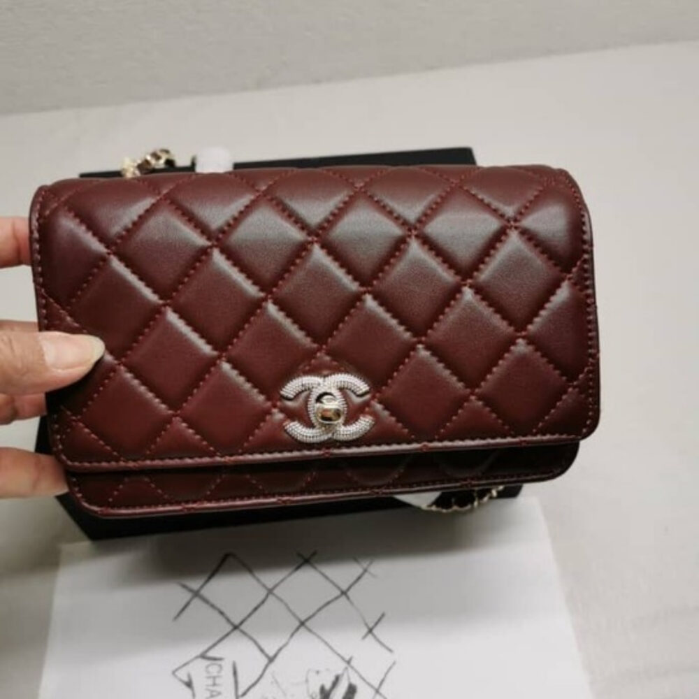 The Chanel Wallet on Chain (WOC) AP4299 in Diamond Quilted Burgundy (20cm) is a sophisticated and versatile accessory. Crafted from luxurious leather with Chanel’s signature diamond quilting, it features a sleek silhouette accented by the iconic CC logo.