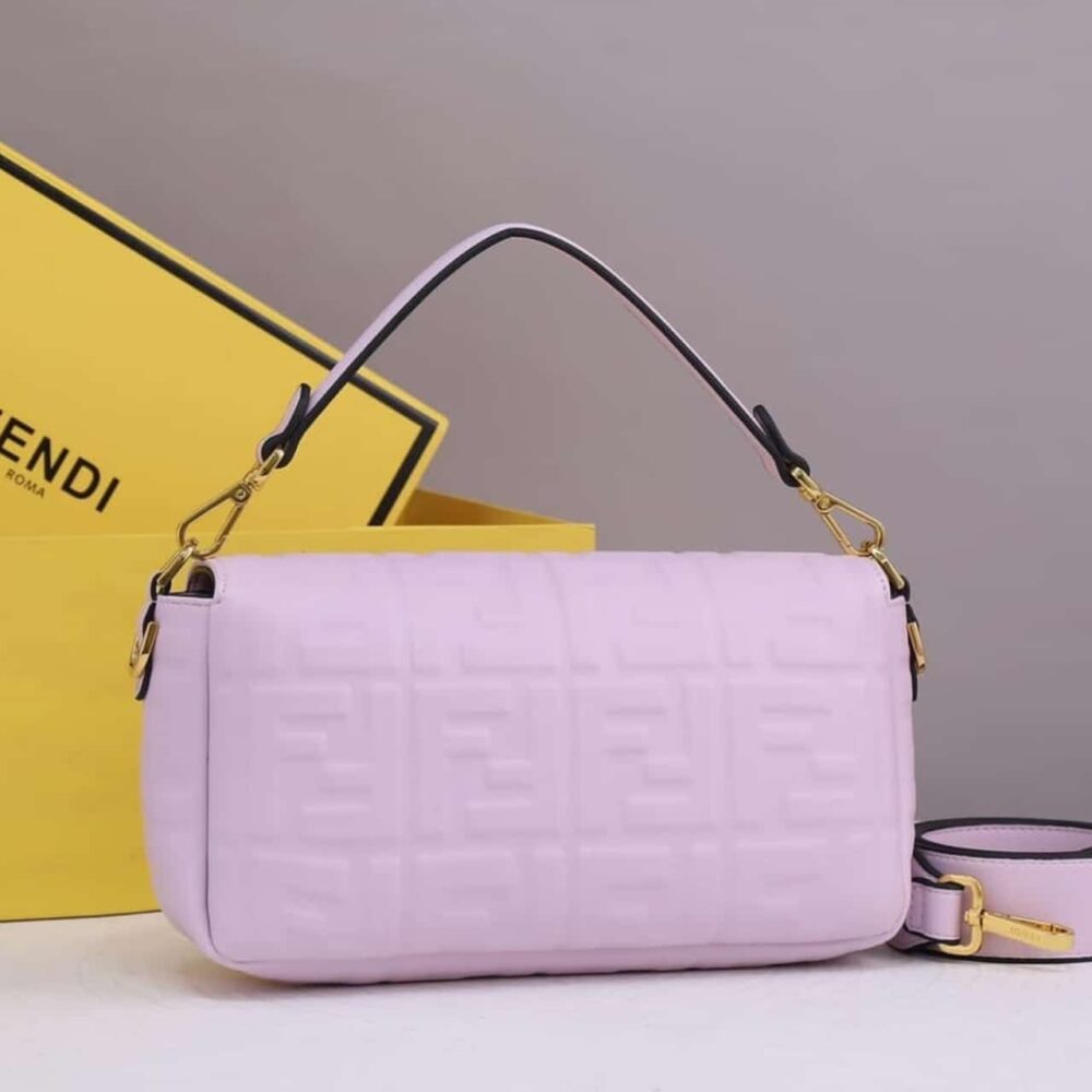 This is the Fendi Baguette Bag with embossed FF motif. It features a front flap with the signature FF buckle in gold-tone hardware. The bag comes with both a top handle and a detachable shoulder strap for versatile styling.