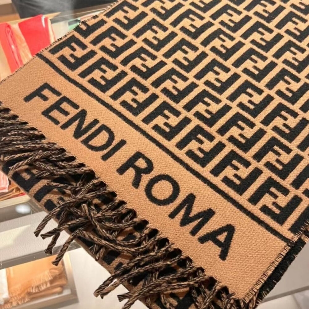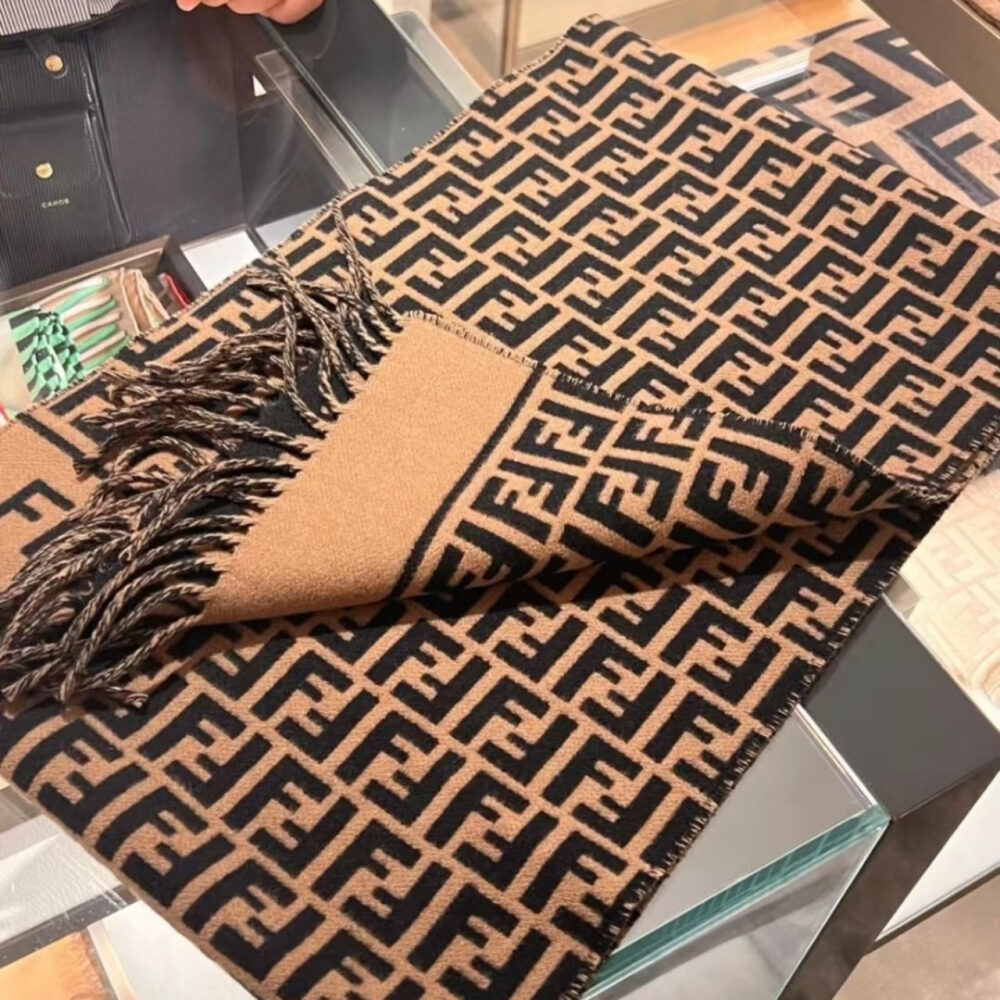 A timeless Fendi icon, this reversible scarf showcases the signature FF monogram woven in rich camel and deep black tones. The fringed edges add texture and movement, perfect for elegant layering in cooler weather.