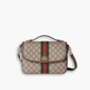 It features beige/ebony GG Supreme canvas with brown leather trim and a bold gold-tone interlocking G detail. The bag comes with a detachable Web stripe strap, offering both elegance and versatility.