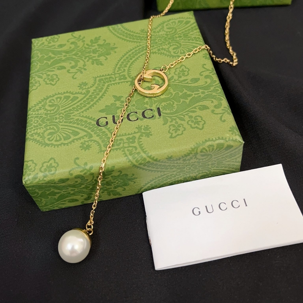 The House’s recognizable logo, the Round Interlocking G, is highlighted in plain gold-toned styles and gold-toned designs in the fashion jewelry line. It’s the main focus of this sophisticated necklace, further enriched by a glass pearl detail.