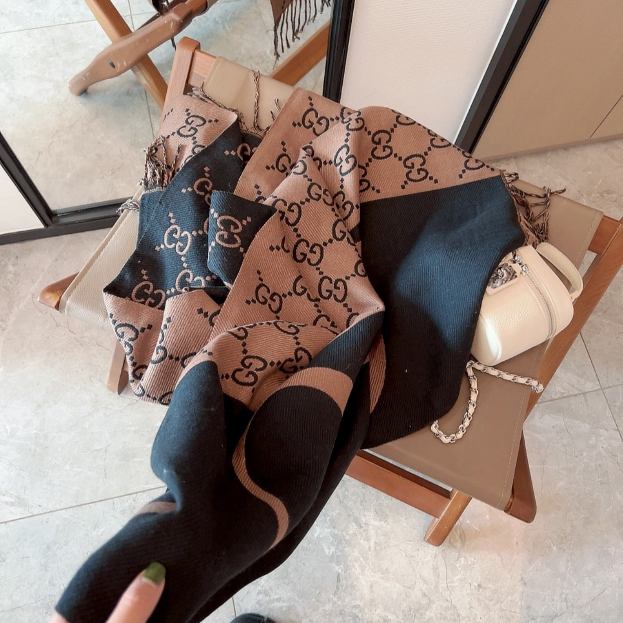 This scarf embodies Gucci’s classic aesthetic—refined yet versatile, perfect for both men and women. It pairs beautifully with neutral coats or monochrome outfits for a luxurious winter look.