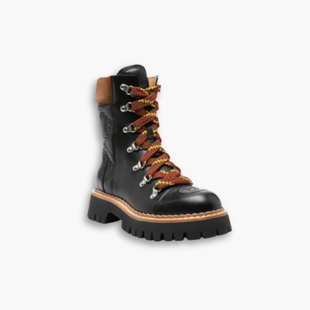 Command attention with this bold combat boot that blends rugged edge with refined craftsmanship. Designed with a thick treaded sole for confident steps, it features vibrant red-and-yellow hiking-style laces that add a pop of color and personality. The sleek black upper is accented with subtle embossed details and a contrast tan collar, giving it a statement-making yet versatile look.