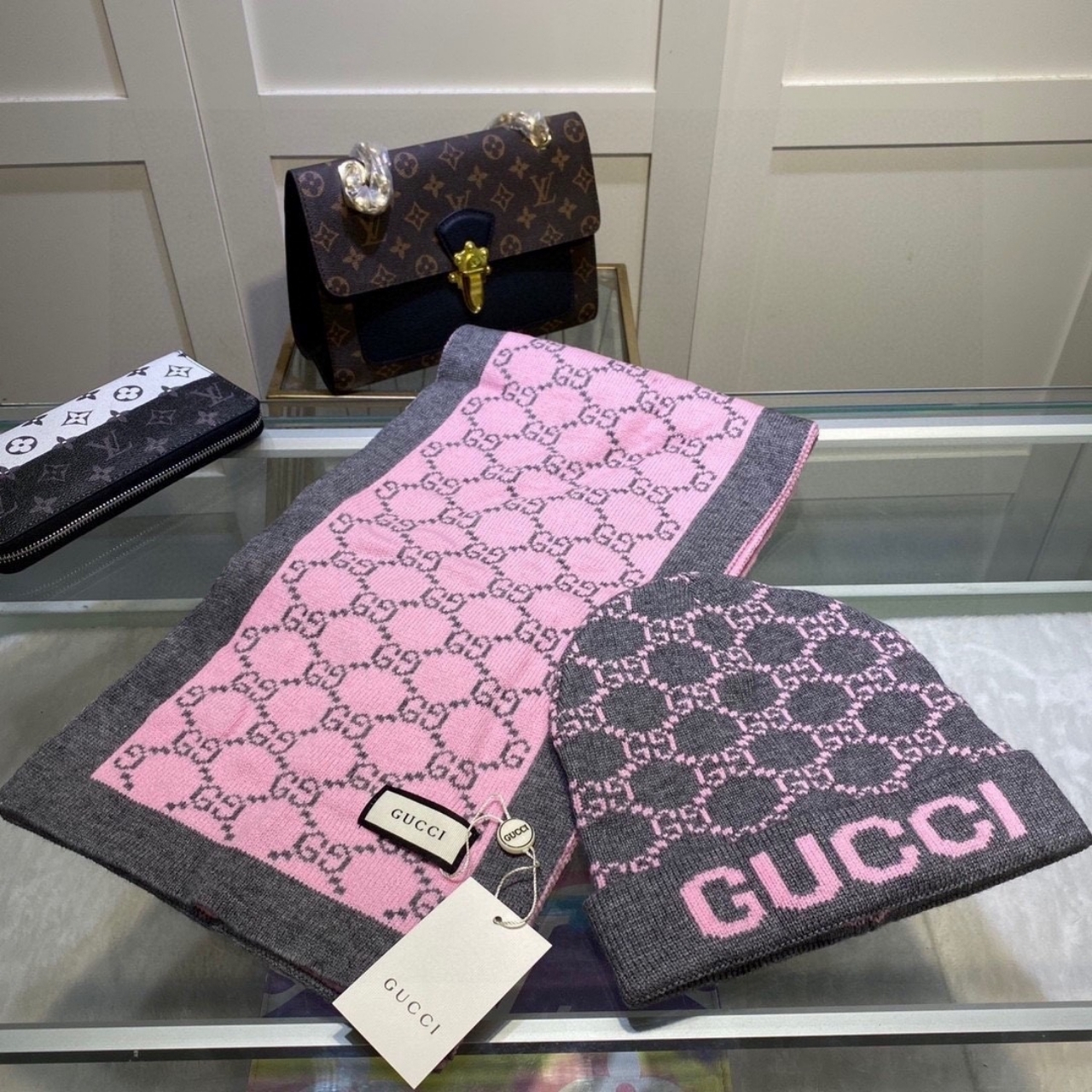 Gucci Jacquard Casual Muffler Beanie And Scarf Pink And Grey Wool Set