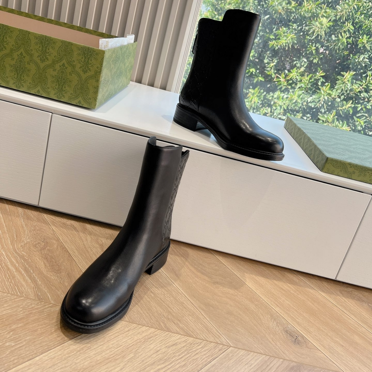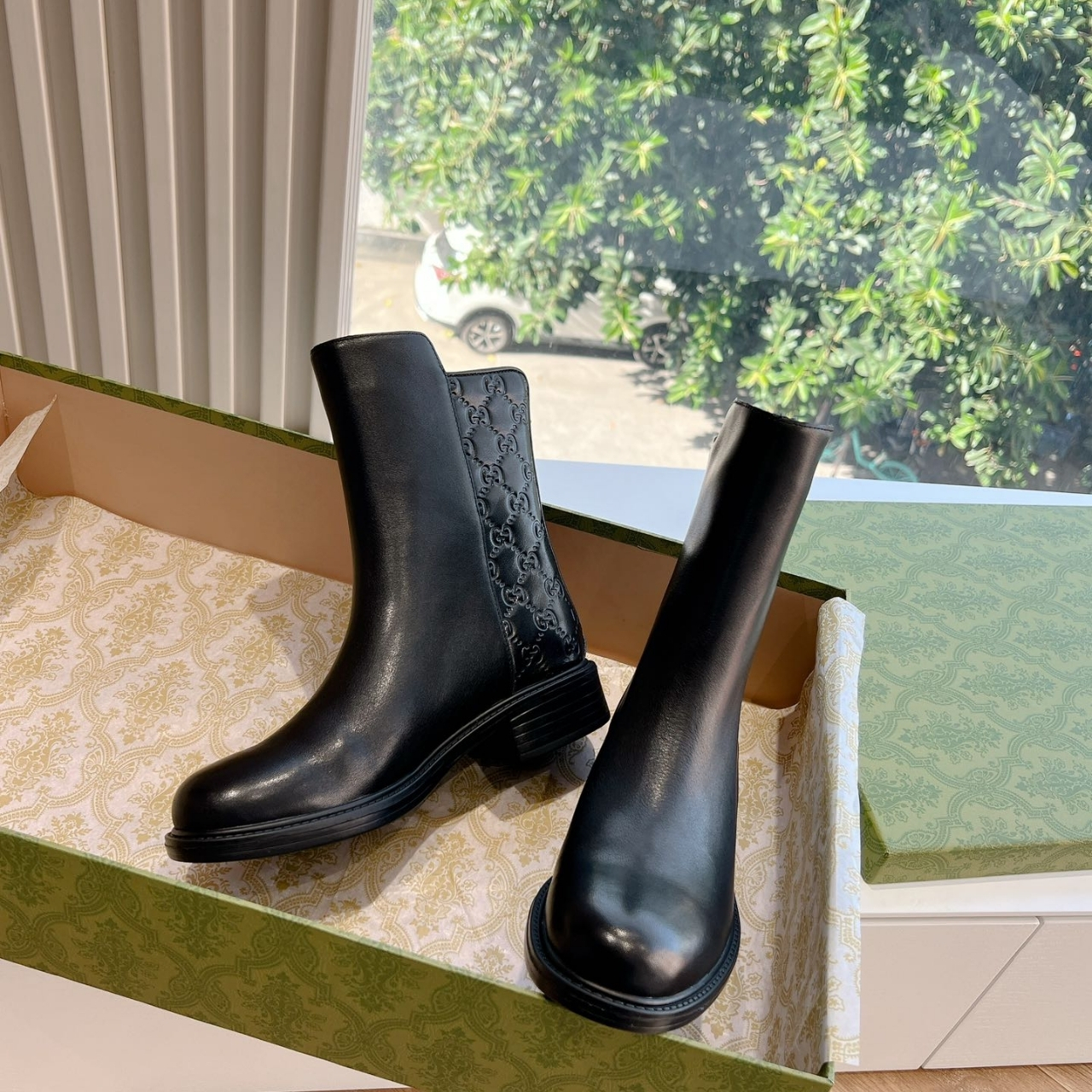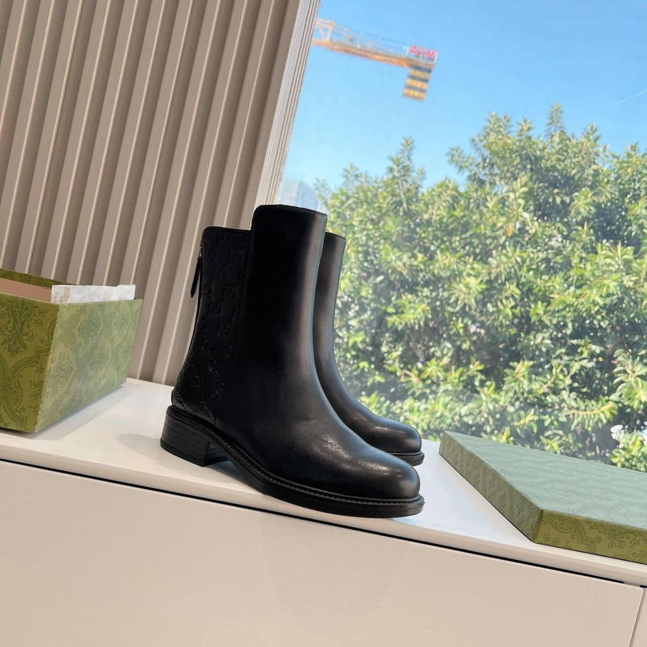 These Gucci ankle boots embody timeless sophistication with a sleek black silhouette and refined craftsmanship. The embossed GG motif at the heel adds a subtle yet powerful statement of luxury. Designed with a smooth finish and a low stacked heel, they exude elegance and versatility for both day and evening wear.