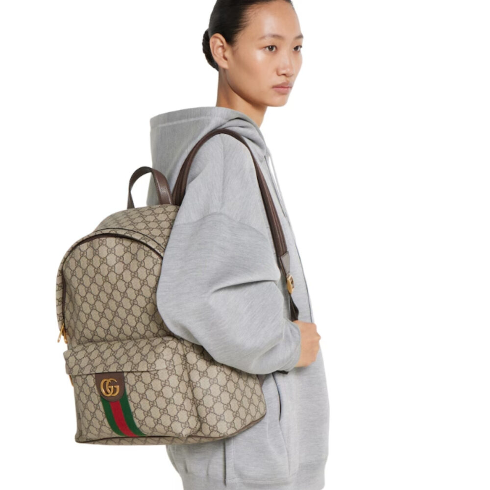 The Ophidia collection evokes the House’s heritage with the signature Web stripe and Double G emblem in light gold-toned finish. The styles are crafted from soft GG Monogram coated fabric.