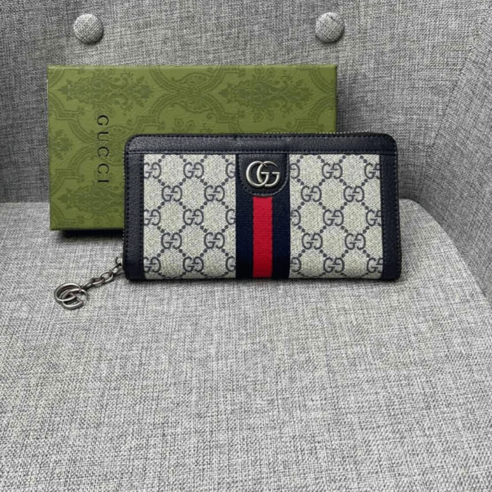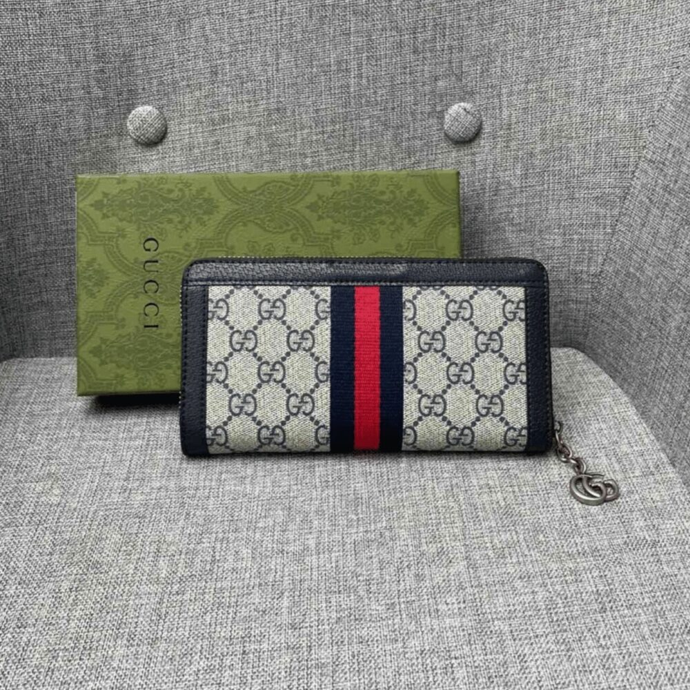 Gucci Ophidia GG Zip Around Wallet in balck color scheme. The wallet features the iconic Gucci monogram canvas and a distinctive red and green stripe.