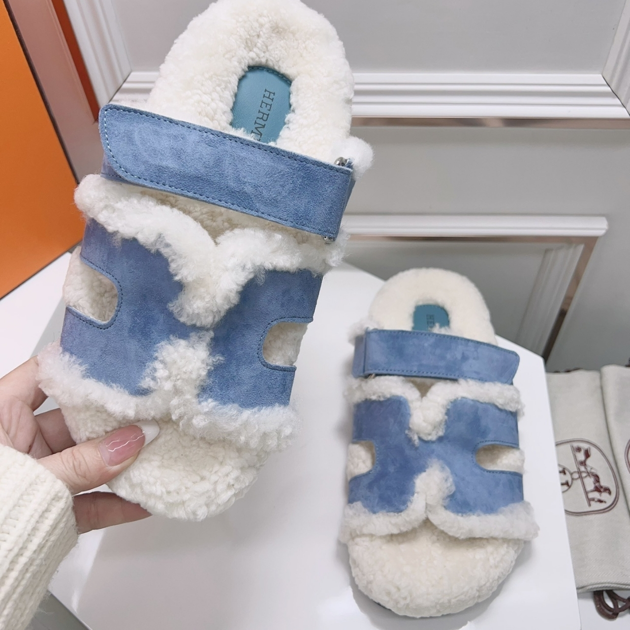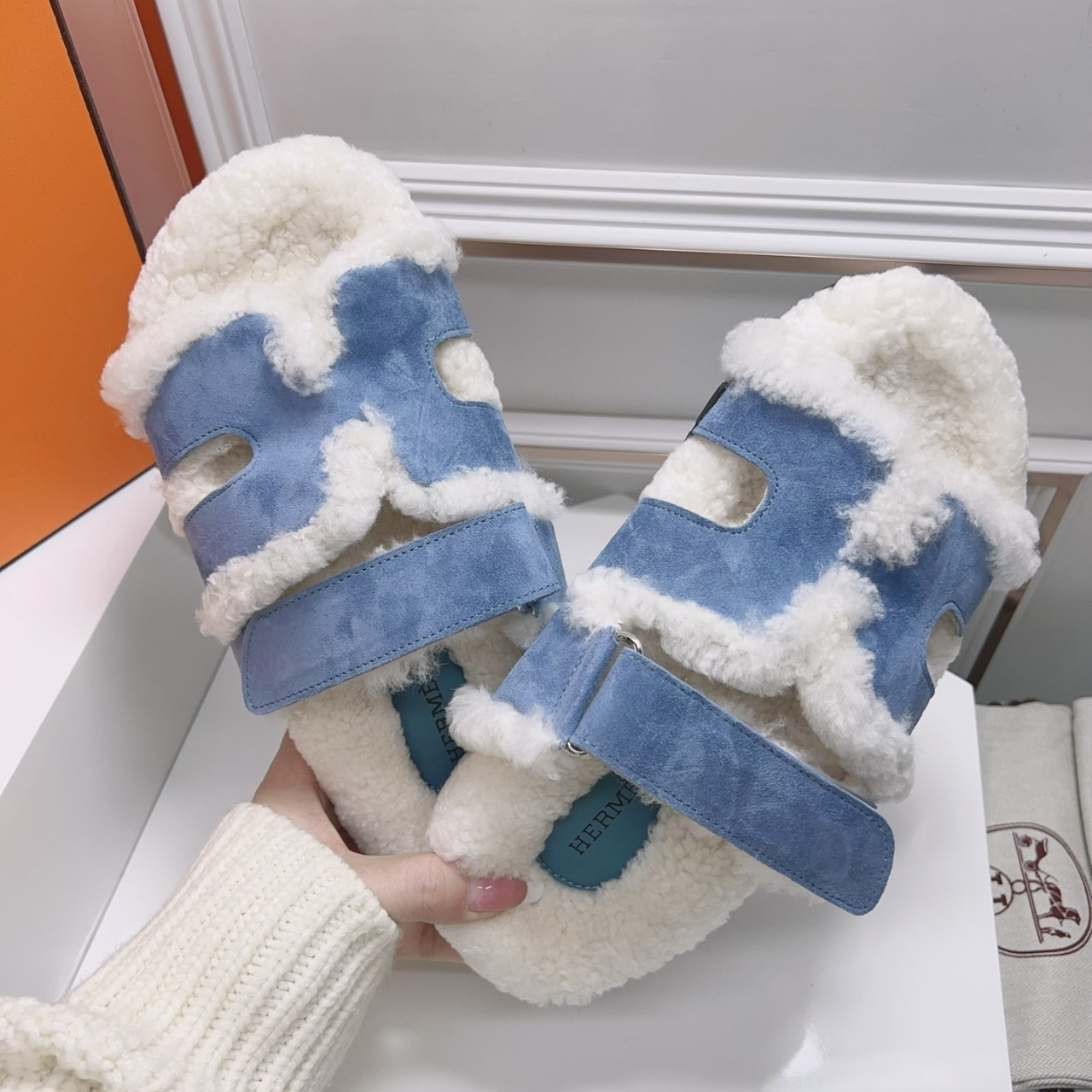 These stylish Hermès sandals feature the signature “H” cut-out straps in blue. The contrast between sleek leather and soft texture creates a chic, modern look that’s both relaxed and elegant — perfect for effortless sophistication at home or on casual outings.