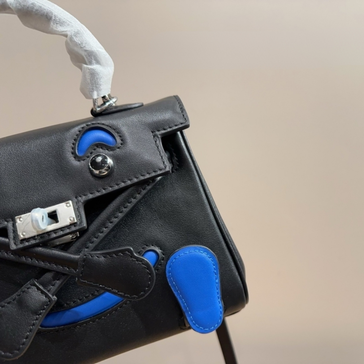 This playful Hermès Kelly bag brings a whimsical twist to luxury with its face-inspired design. Crafted in black with bold blue accents, it balances fun and sophistication effortlessly. Compact yet full of character, it’s a charming statement piece for fashion lovers who dare to stand out.