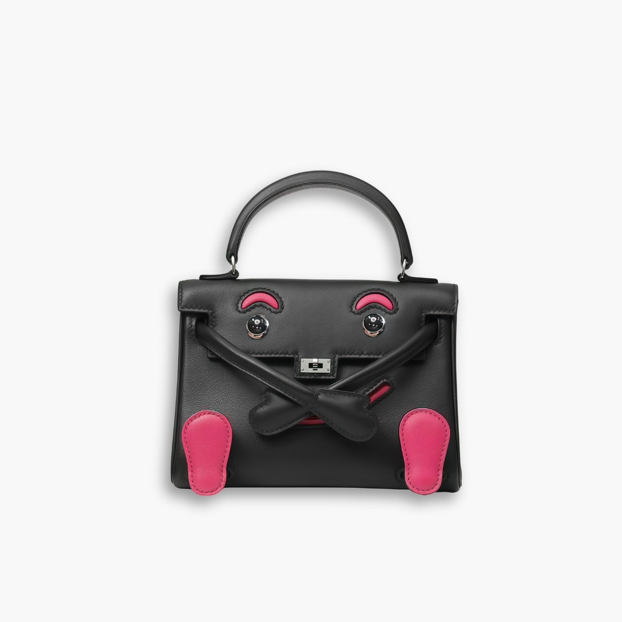 This playful Hermès Kelly bag brings a whimsical twist to luxury with its face-inspired design. Crafted in black with bold pink accents, it balances fun and sophistication effortlessly. Compact yet full of character, it’s a charming statement piece for fashion lovers who dare to stand out.