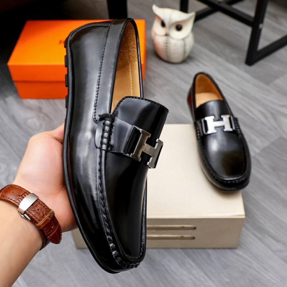 Replica 1:1 – Hermes Men Loafer Moccasin Polish Leather With H Silver In Black