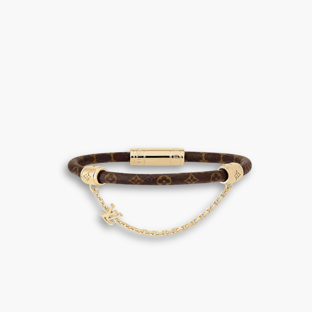 Sleek and contemporary, this Chain It bracelet features a Monogram canvas cord and a removable brass chain adorned with an LV charm. Finished with a Louis Vuitton signature on the clasp, this sophisticated piece is available in two iconic colors with a gold or silver finish.