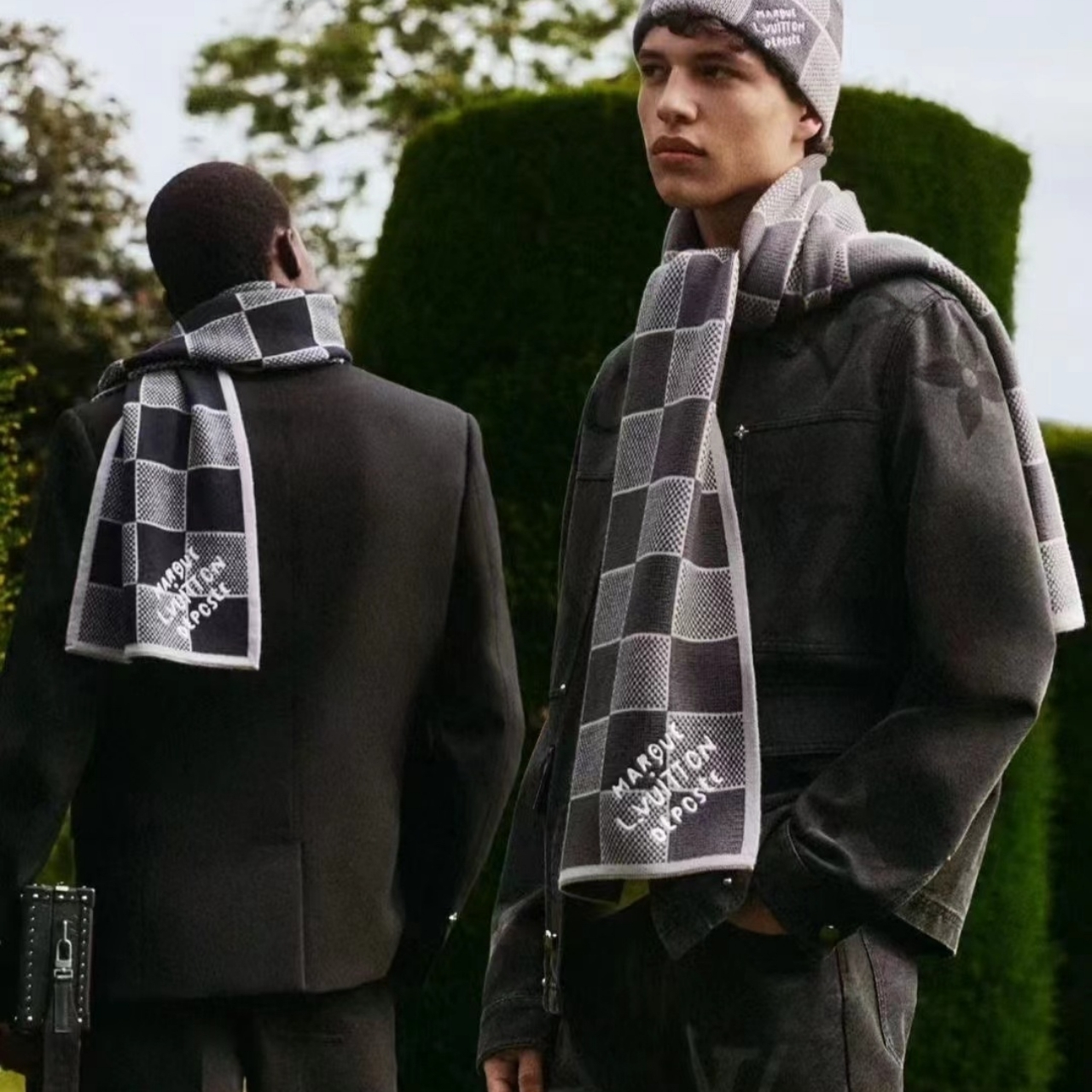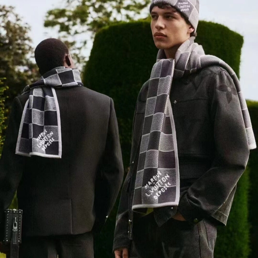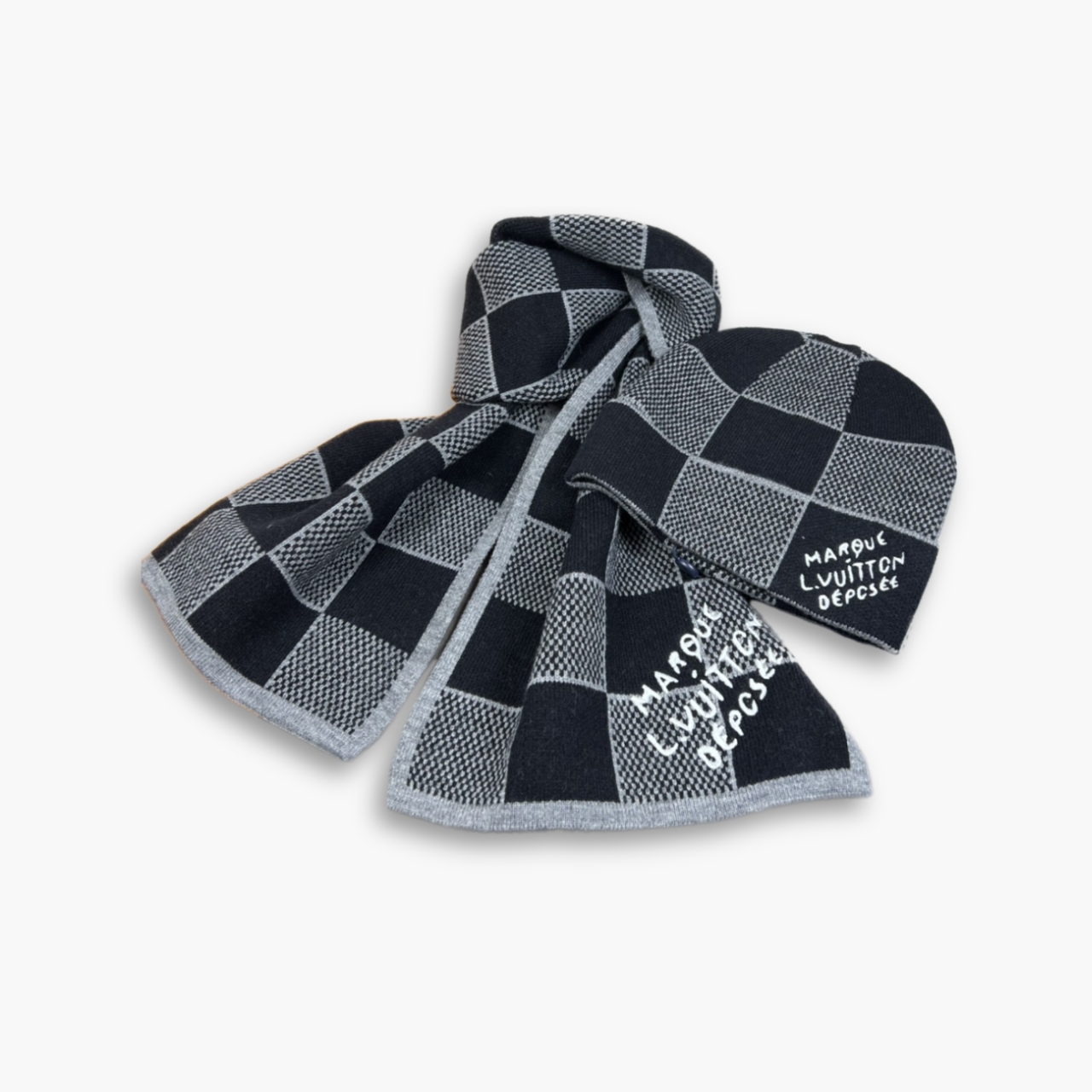 This set is highly attractive for its bold, graphic contrast, utilizing the large-scale Damier check in black and heather gray for a strong, modern visual statement. The striking white “MARQUE L.VUITTON DÉPOSÉE” text knit directly into the beanie and scarf provides a vintage-inspired brand signature, giving the set a sophisticated, street-style edge.
