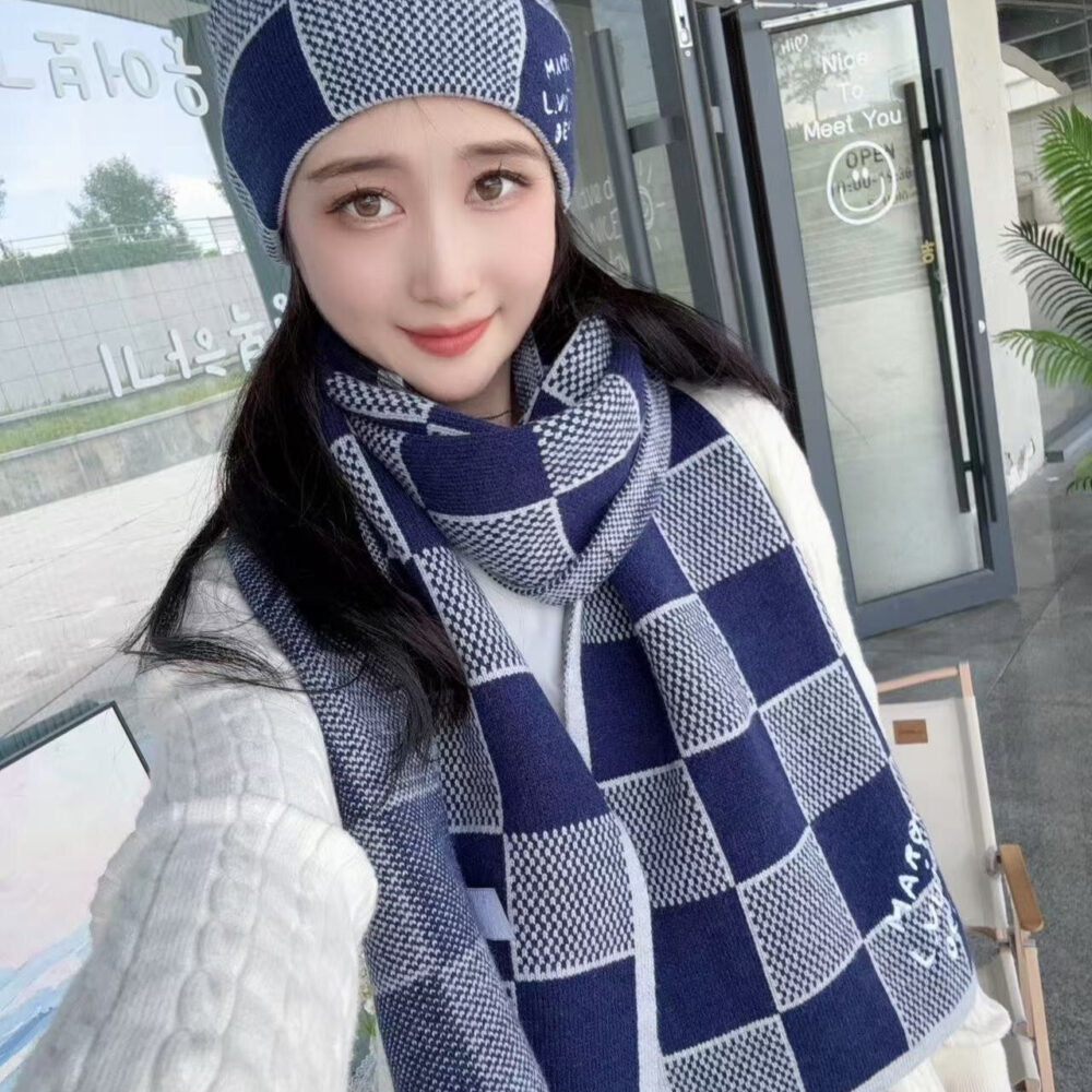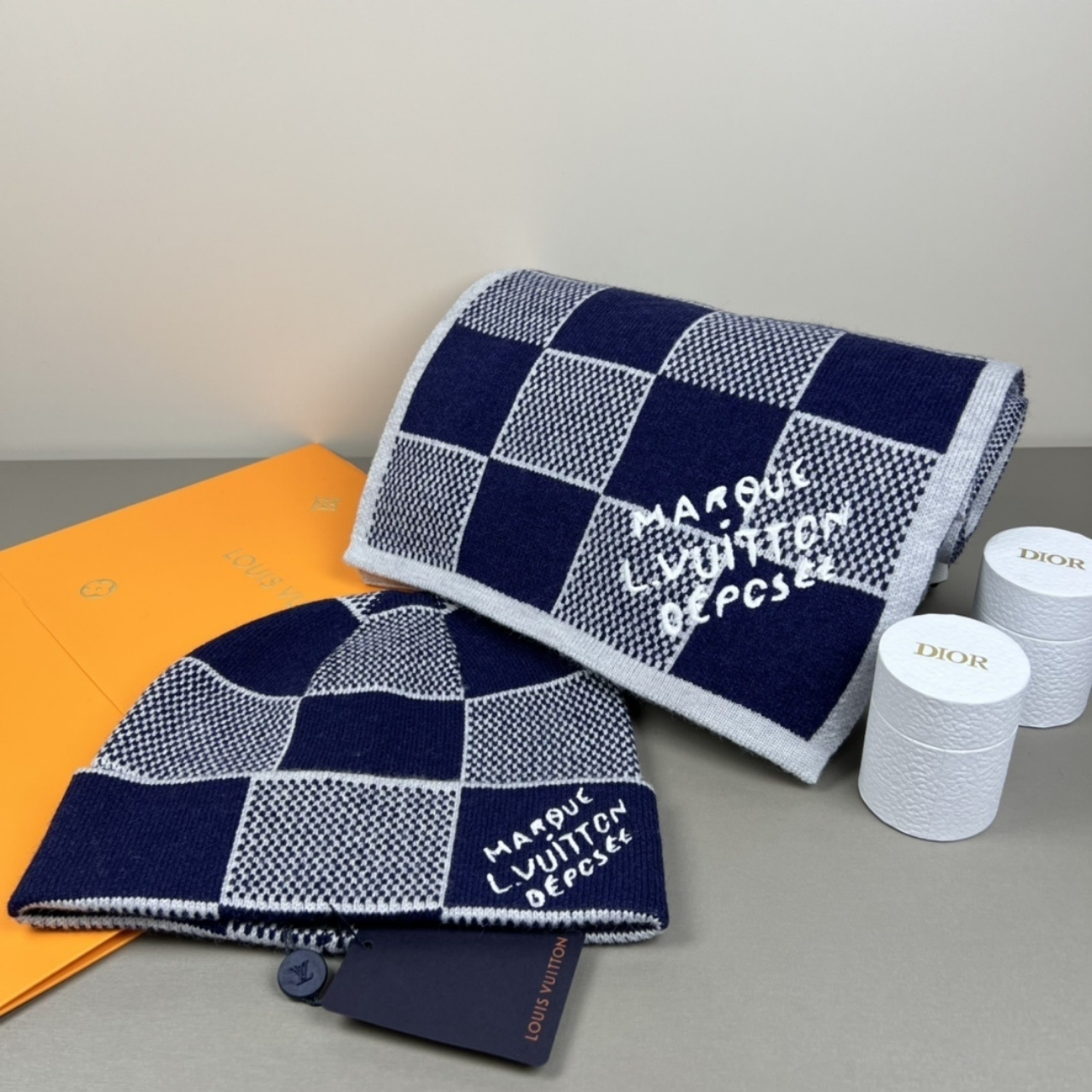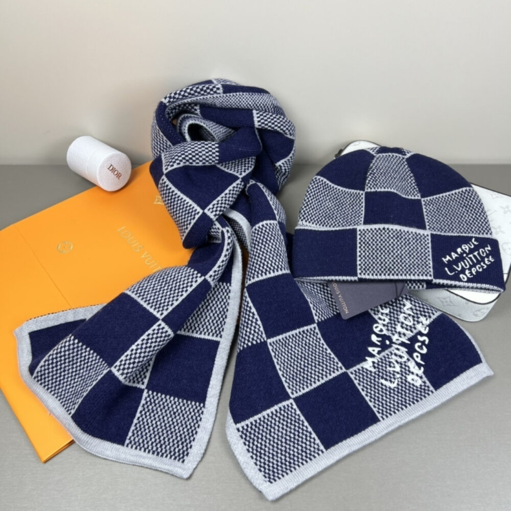 Replica 1:1 – Louis Vuitton Damier Heritage Beanie And Scarf Navy Wool Set