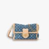 The Mini Dauphine handbag is made from leather, with its unique textured aspect. The bag’s distinctive shape is echoed by the LV Circle in a golden rectangle.