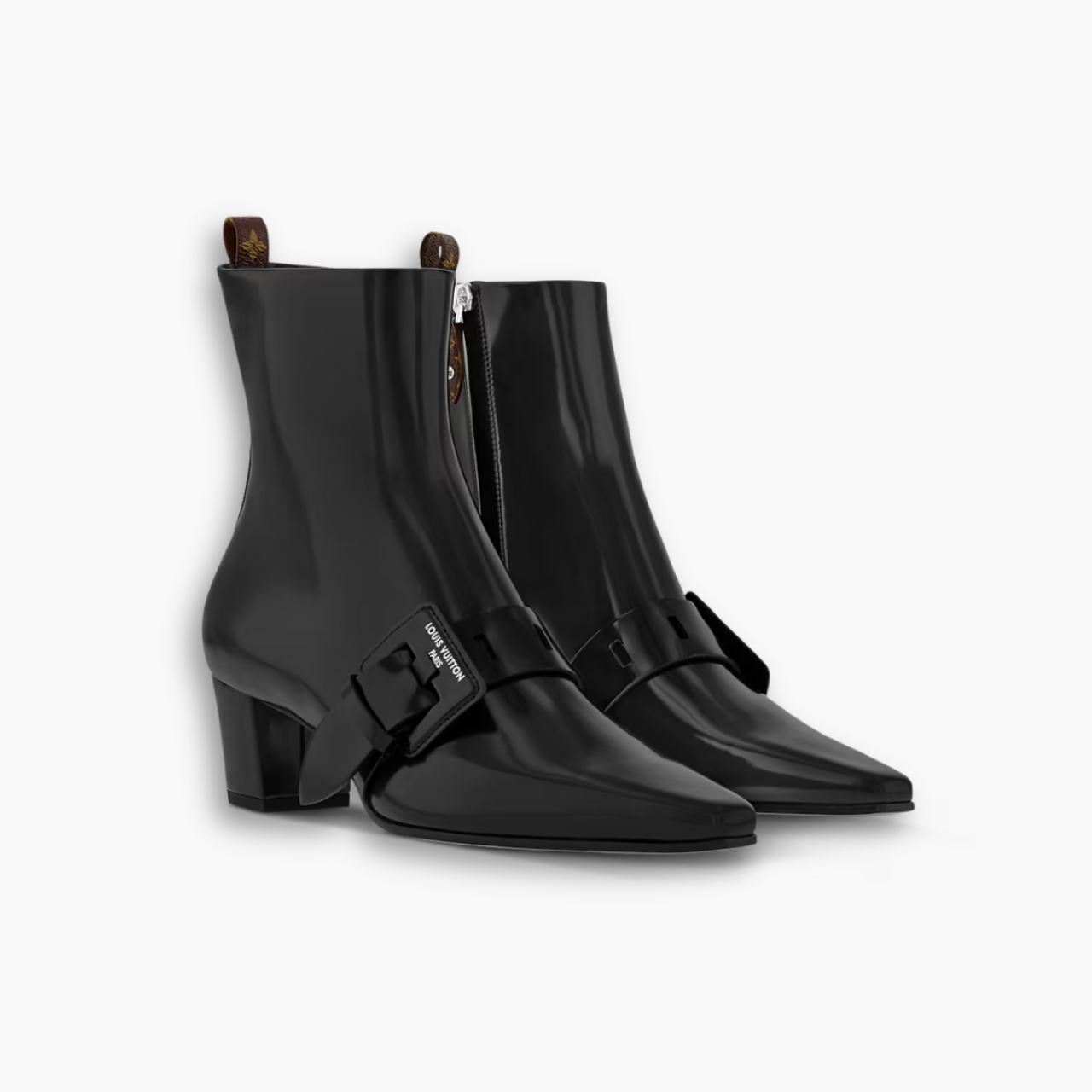 The Fusée ankle boot in glazed leather was the statement shoe of the Cruise 2025 show. Inspired by the Sixties, it has a streamlined design with a pointed toe, which is complemented by a decorative strap and a square buckle stamped with the Louis Vuitton signature. This model is finished with a low, angled heel and a back loop in Monogram canvas.