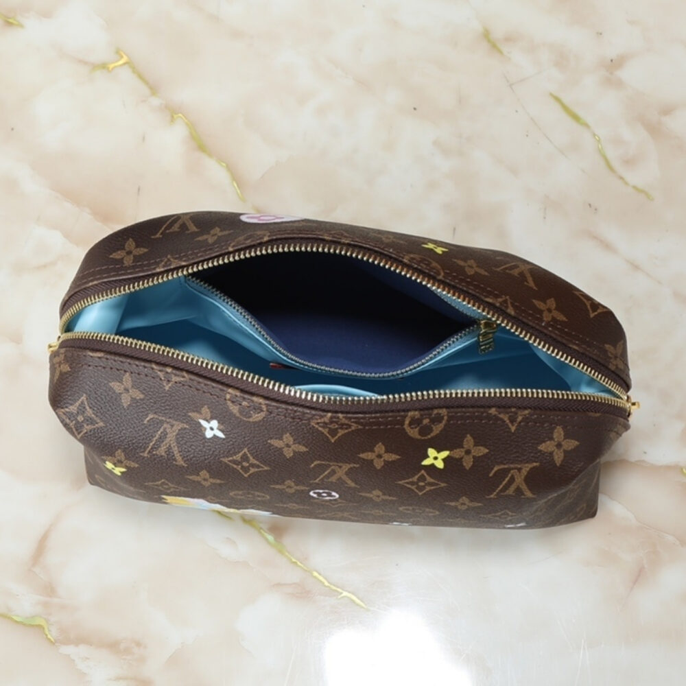 The Cosmetic Pouch GM in Monogram coated canvas features a colorful print of Vivienne, the Louis Vuitton mascot, along with miniature Monogram Flowers. This whimsical touch complements the classic Monogram pattern and gold-toned hardware. The interior boasts two flat pockets, one with a zipper.