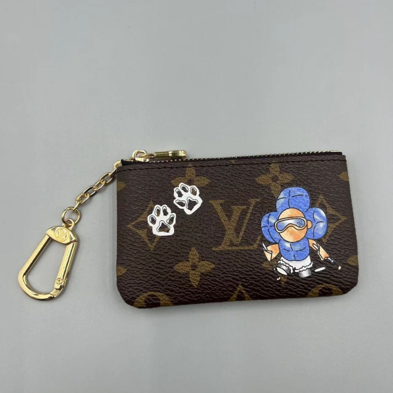 The Vivienne Winter Holiday collection presents this charming edition of the classic Key Pouch. Crafted from signature Monogram canvas, it is decorated with an illustration of the House’s iconic mascot, alongside two paw prints. The compact design is elevated with a gold-toned key hook and opens to reveal Blue Frost lining.