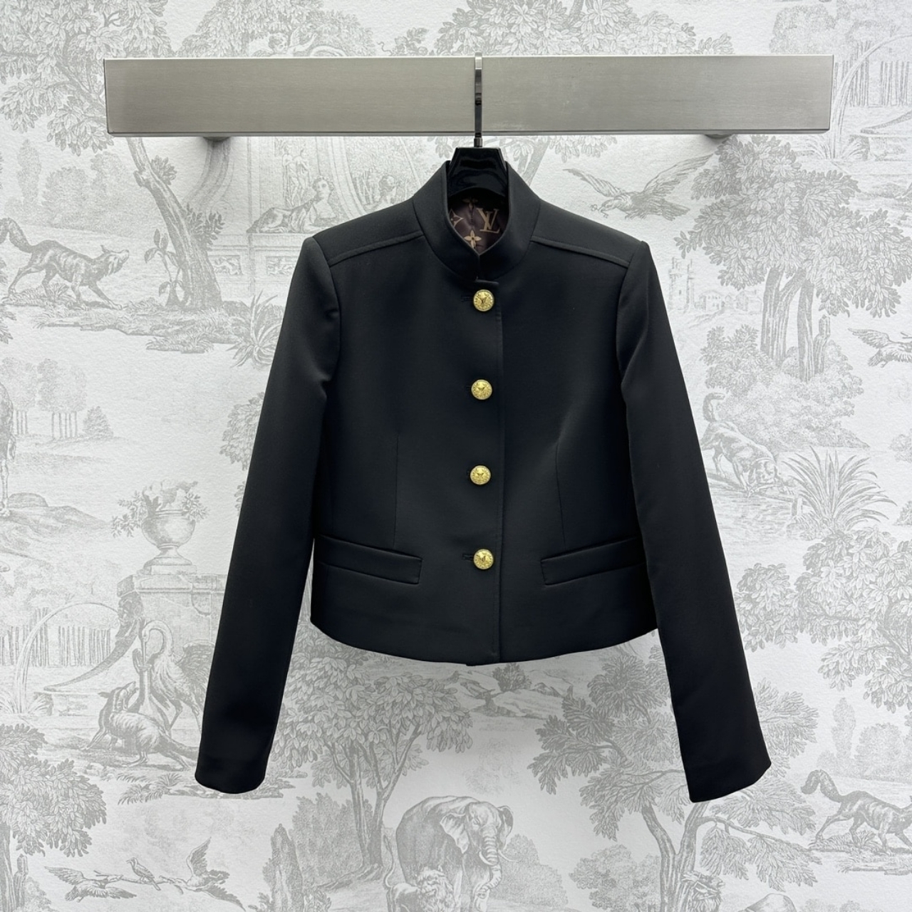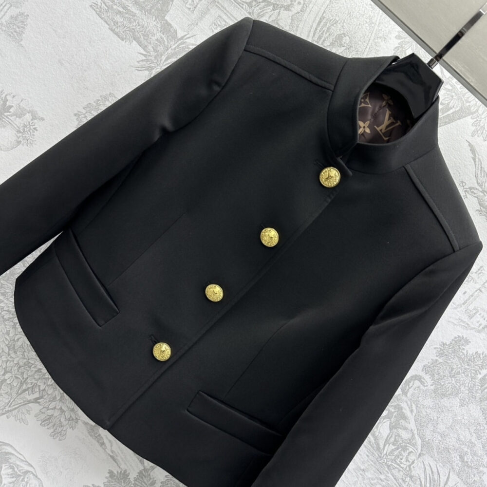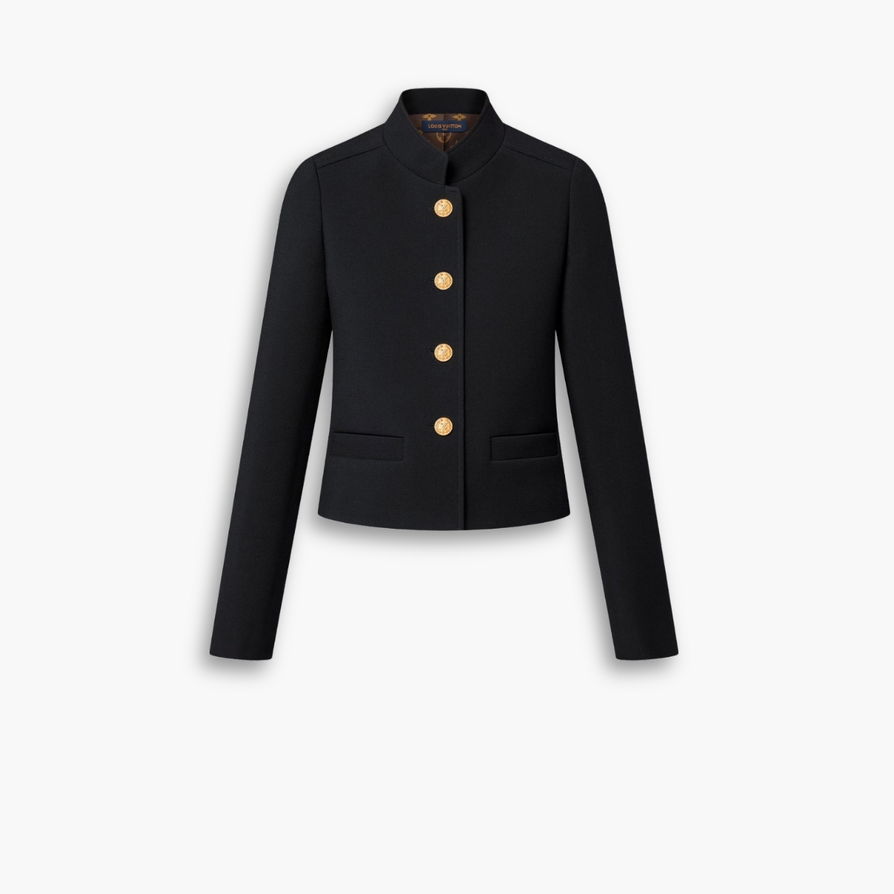 This Louis Vuitton officer-style jacket redefines elegance through minimalist precision and military-inspired tailoring. Crafted from a fine wool blend, it features a structured silhouette with a stand collar and four gold-tone embossed buttons that highlight the front closure. Two front flap pockets complete the refined look, while the clean lines and cropped cut ensure a polished, contemporary edge.