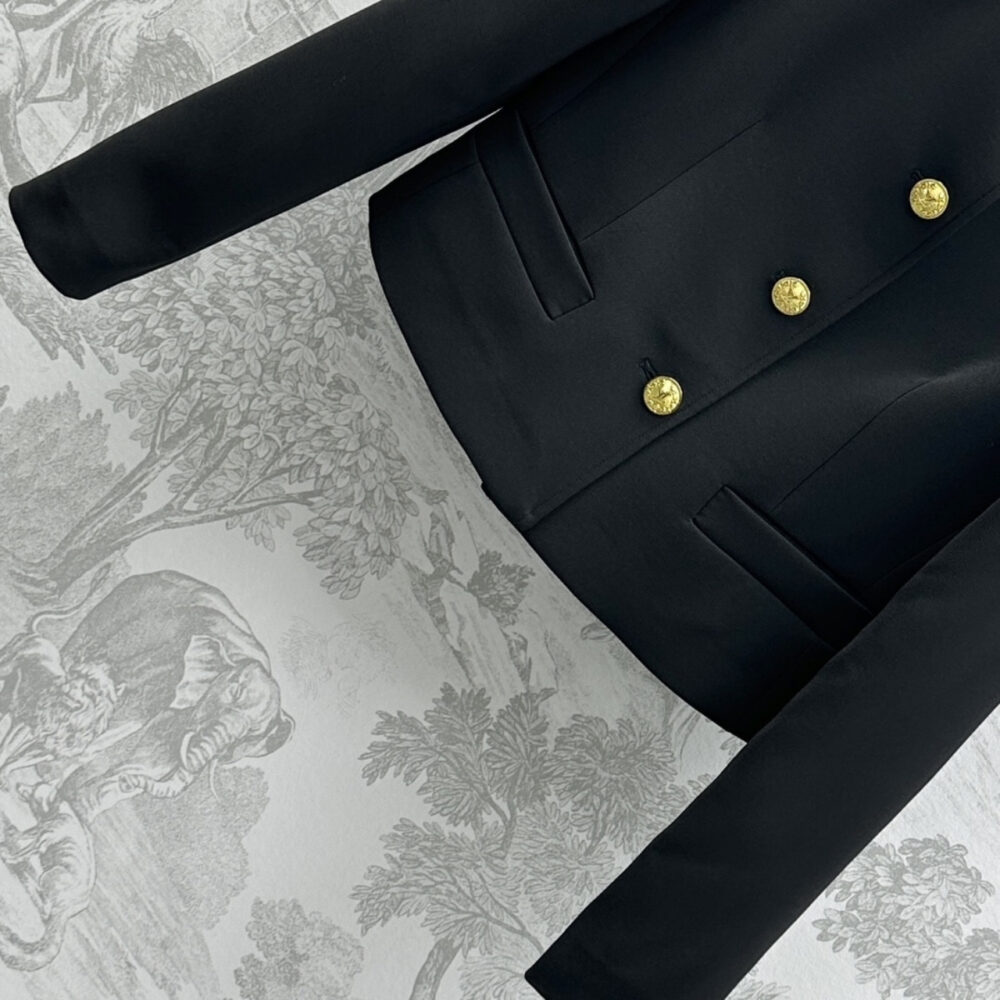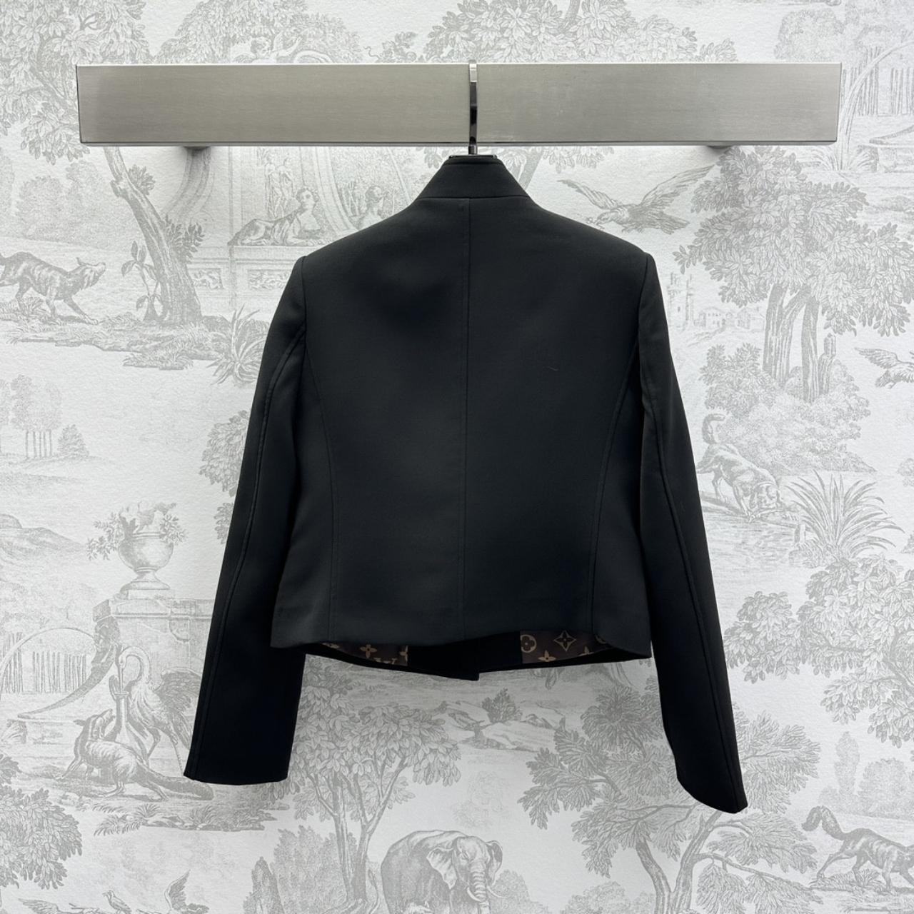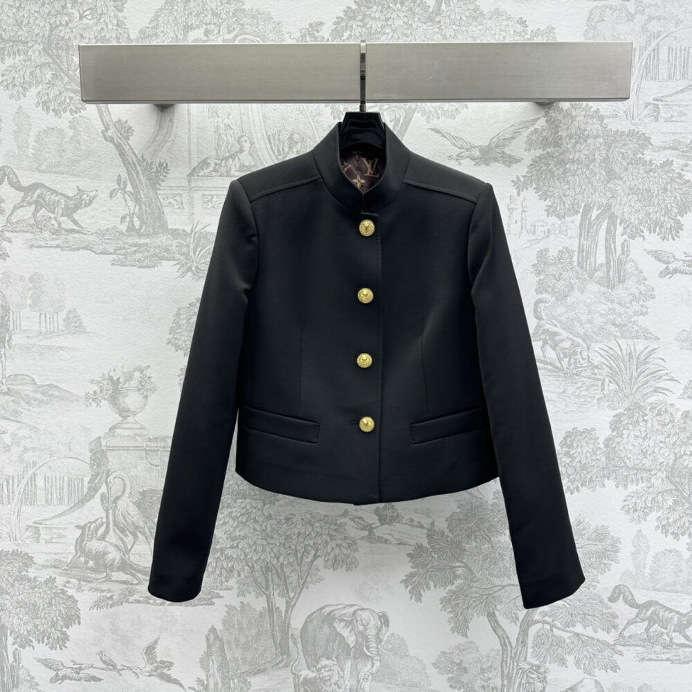 This Louis Vuitton officer-style jacket redefines elegance through minimalist precision and military-inspired tailoring. Crafted from a fine wool blend, it features a structured silhouette with a stand collar and four gold-tone embossed buttons that highlight the front closure. Two front flap pockets complete the refined look, while the clean lines and cropped cut ensure a polished, contemporary edge.