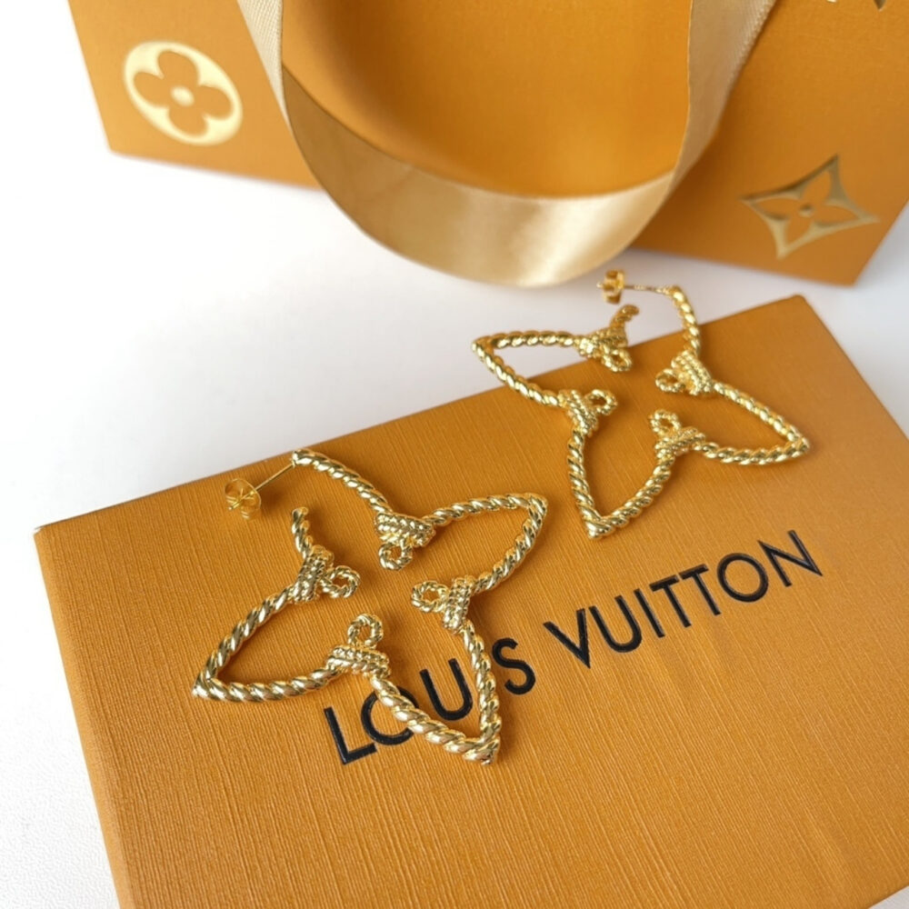 These are Louis Vuitton statement earrings in the shape of the iconic Monogram Flower. Crafted in a twisted gold-tone metal, they have an open, lightweight design that gives a bold yet elegant look. Perfect for adding a chic and modern touch to both casual and evening outfits.