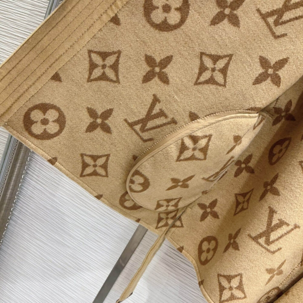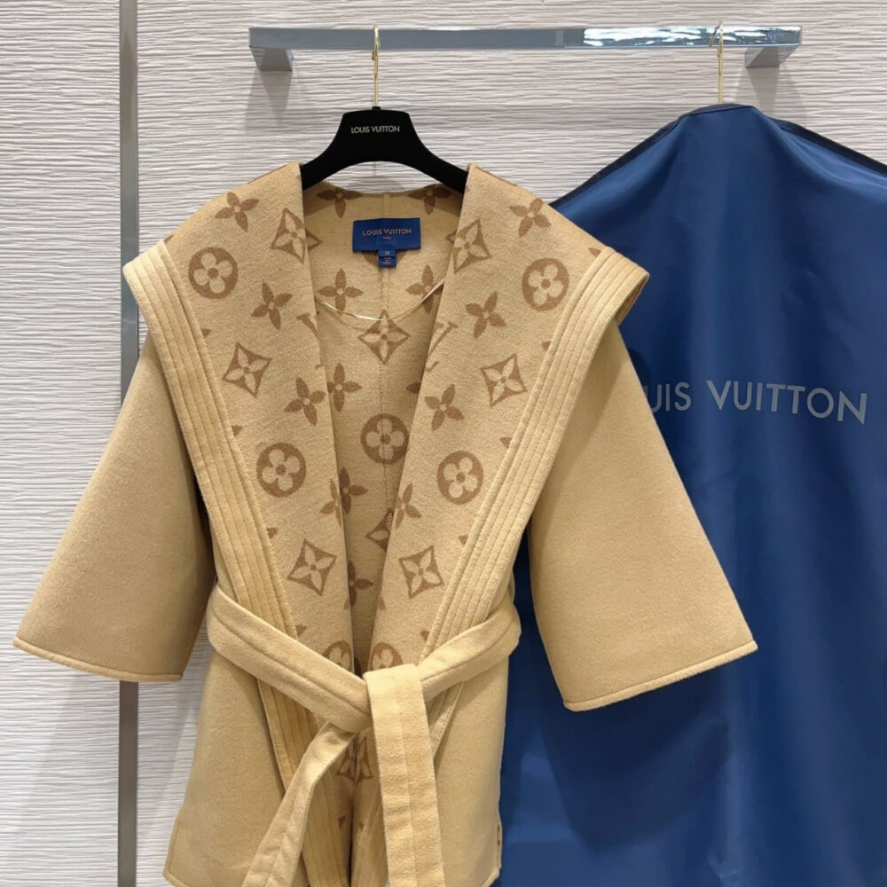 A standout piece blending modern luxury, this Louis Vuitton wrap coat is crafted from premium wool in a warm beige tone. The design features the iconic Monogram motif woven tone-on-tone along the wide shawl collar and inner lining, offering a sophisticated play of texture.