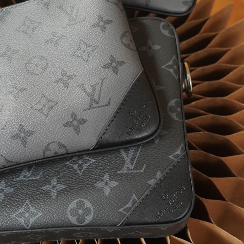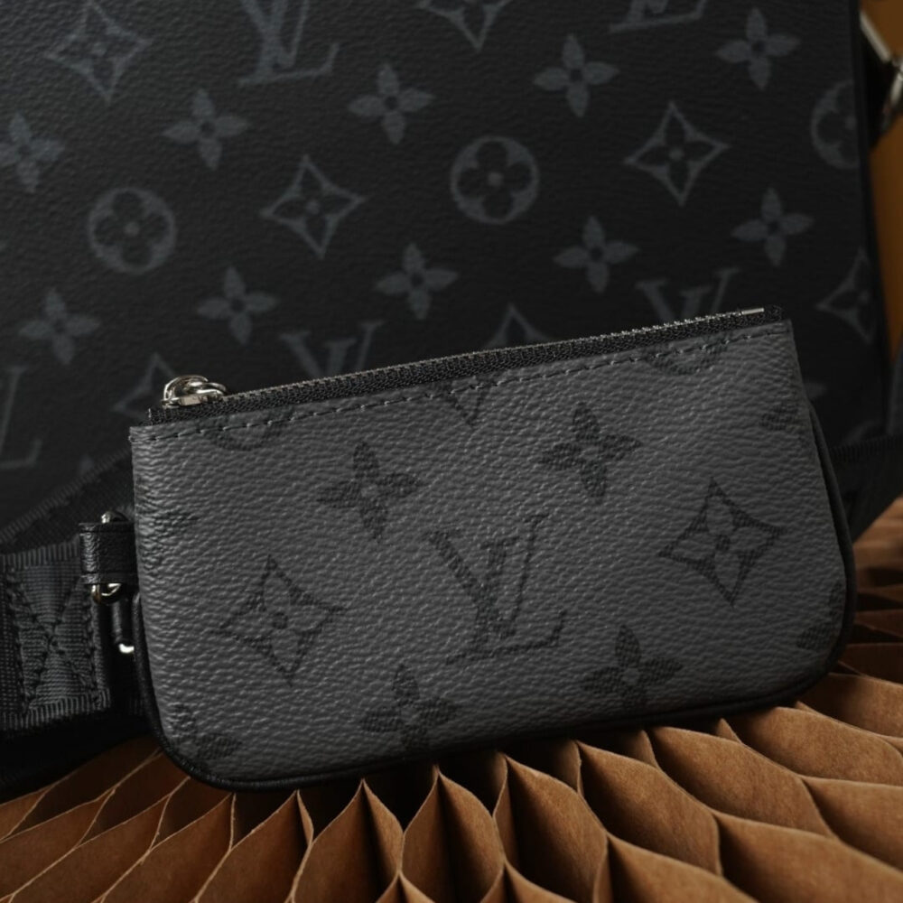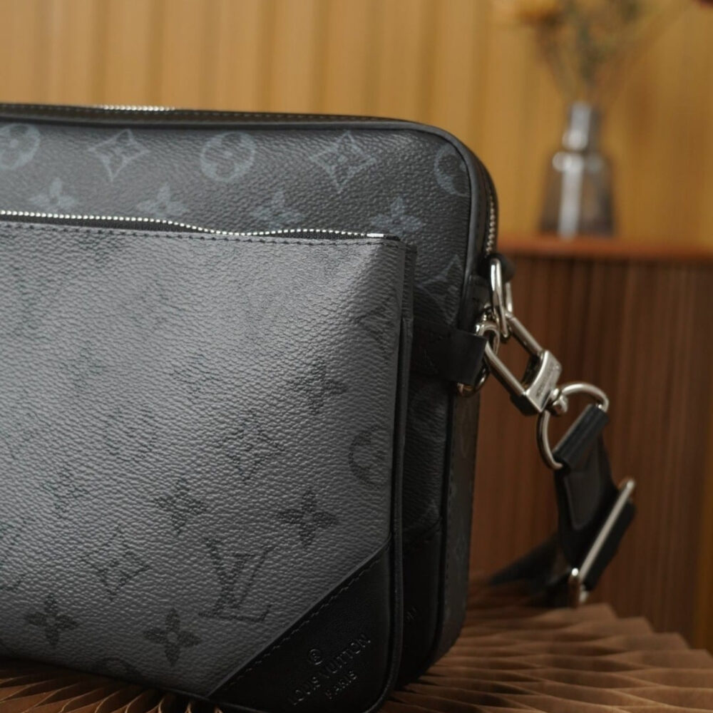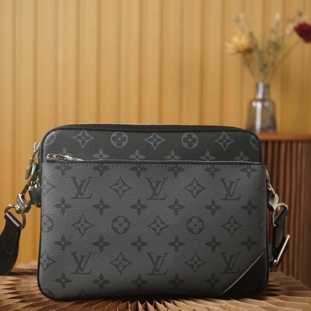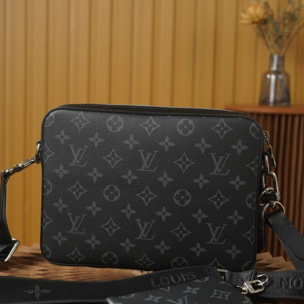The Louis Vuitton Trio Messenger Bag in Monogram Eclipse is a sophisticated and versatile accessory designed for modern lifestyles. Crafted from Monogram Eclipse coated canvas, it features a sleek combination of black and grey tones, offering a contemporary aesthetic.