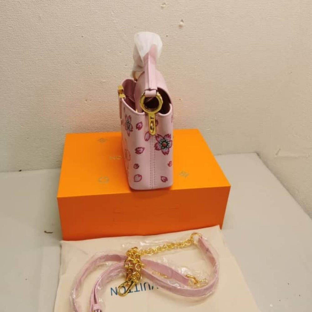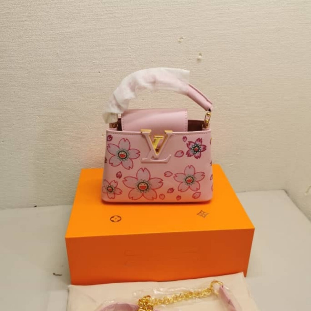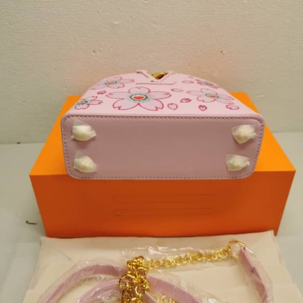 Suddenly, stepping out feels whimsically refined with the Louis Vuitton x Takashi Murakami Capucines Mini Pink. This petite treasure pairs the timeless elegance of the Capucines silhouette with Murakami’s vibrant floral artwork, adding a pop of playful luxury. Crafted in soft pink leather with gold-tone accents and a removable strap, it’s the perfect fusion of classic form and artistic flair.