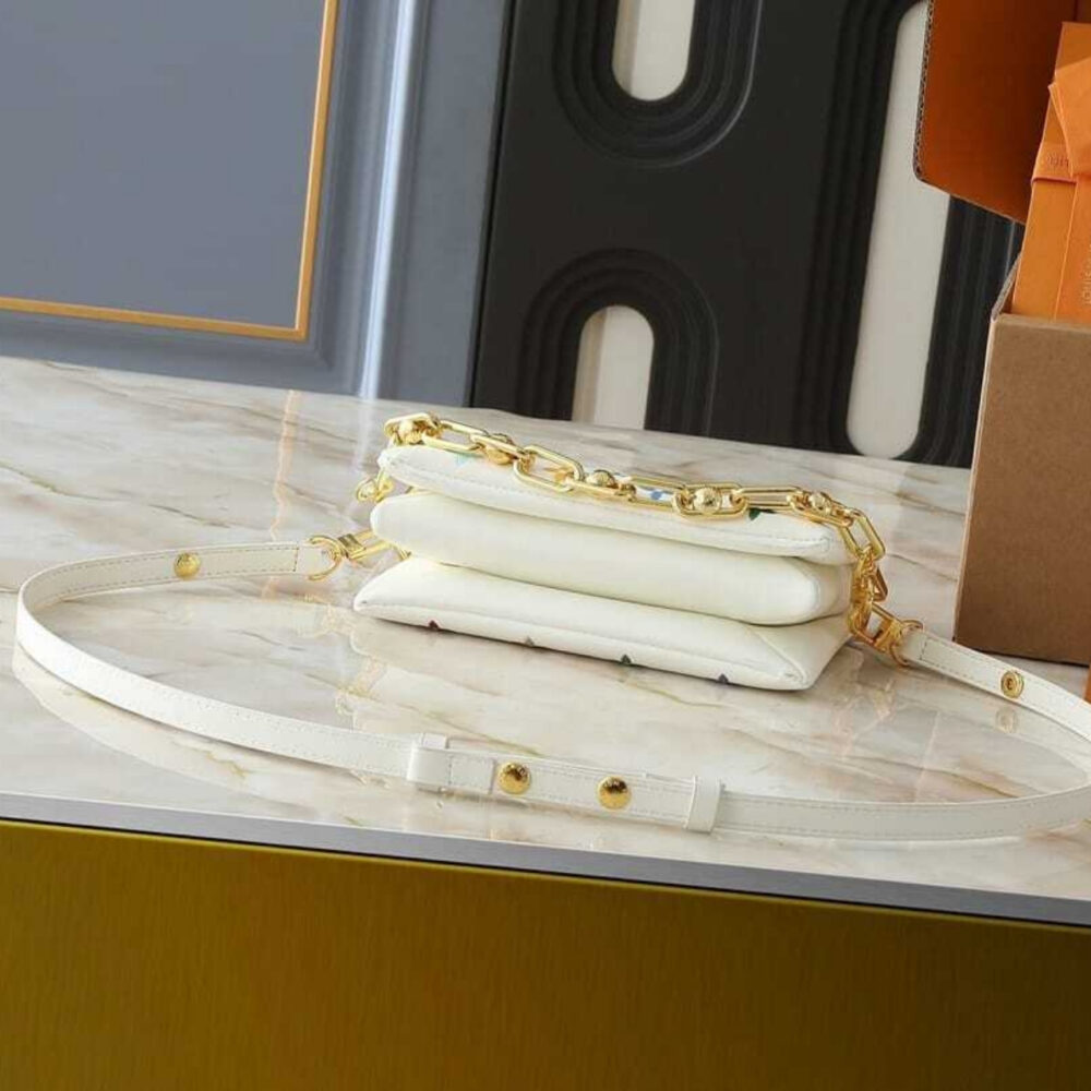 The signature rainbow tones of Japanese artist Takashi Murakami add a playful pop of color to this classic Coussin PM handbag as part of the re-edition of the Louis Vuitton x Murakami collection. Crafted from puffy leather in a sleek silhouette, the multicolored Monogram motif features as an allover print, while a chunky golden chain and removable leather strap offer multiple carry options for daily styling.