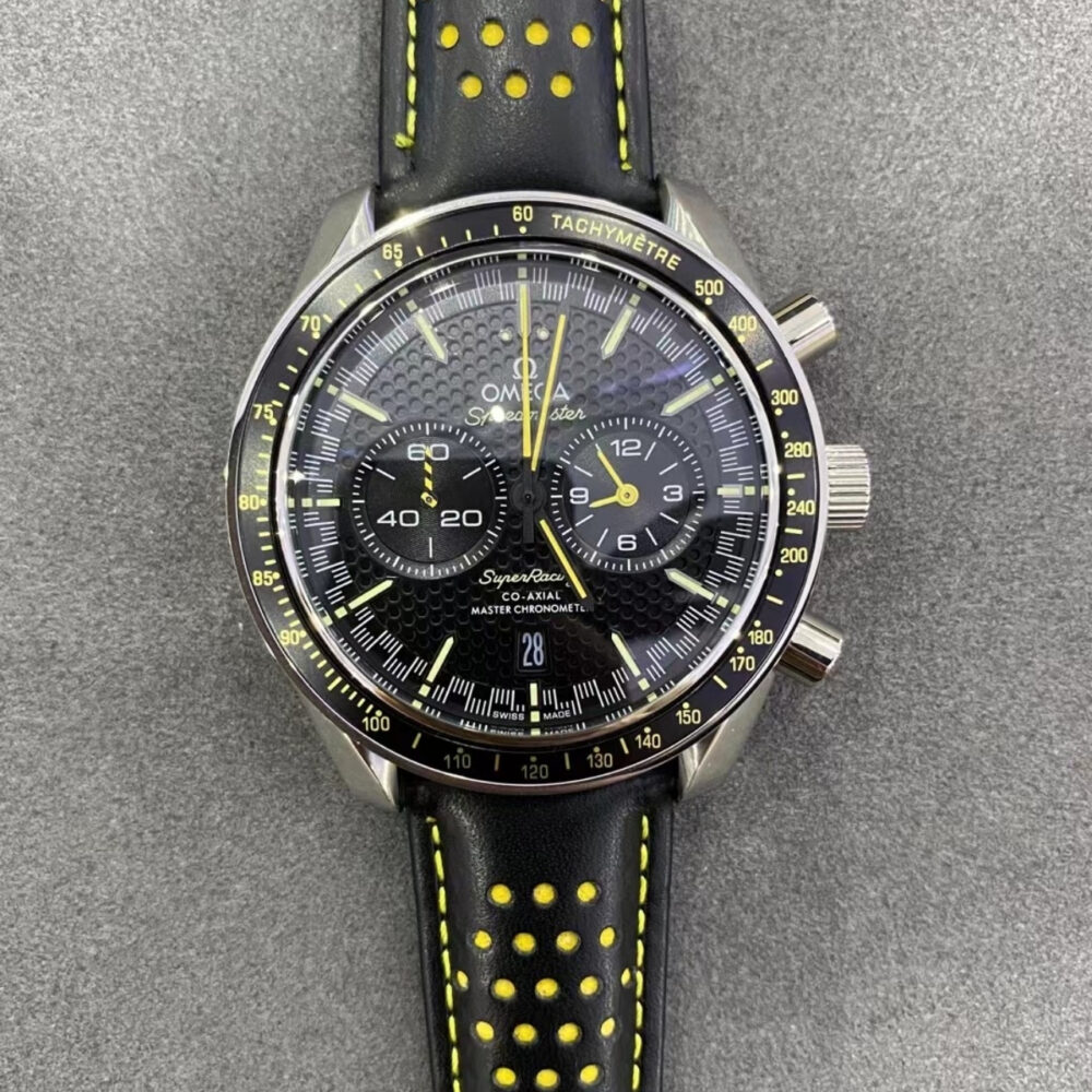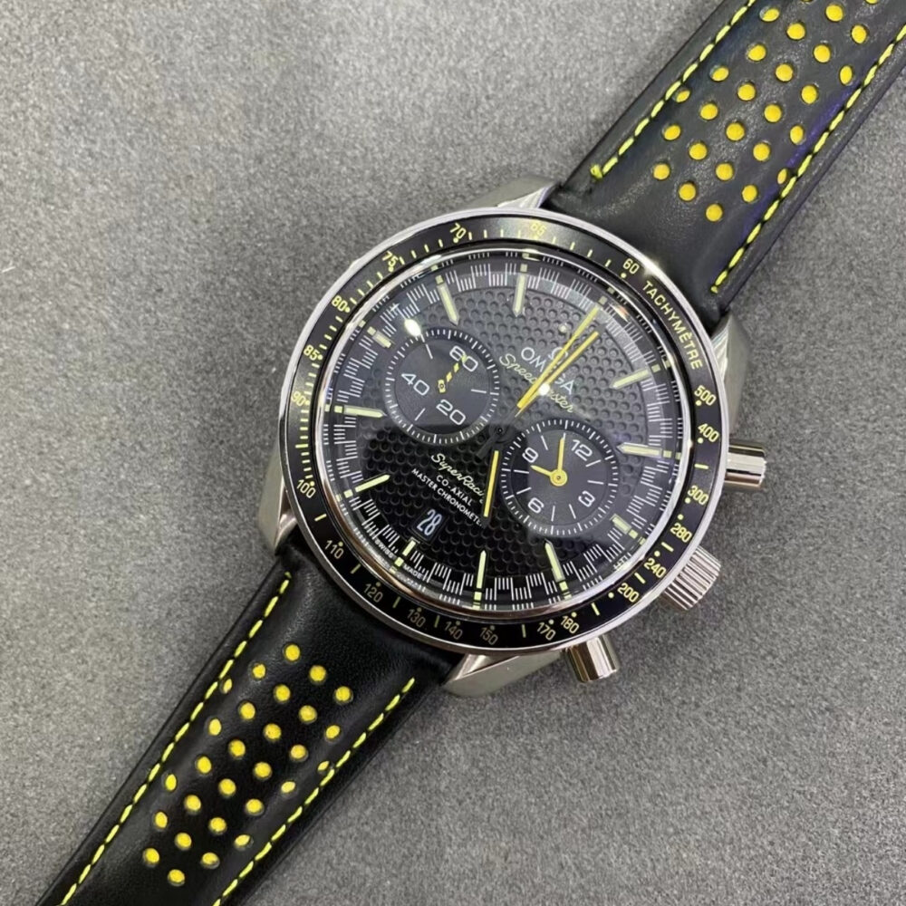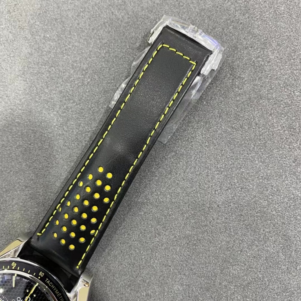 Presented on a perforated black leather strap with a yellow rubber interior, the entire watch is black ceramic and yellow chronograph hands and a Super-LumiNova tachymeter scale.