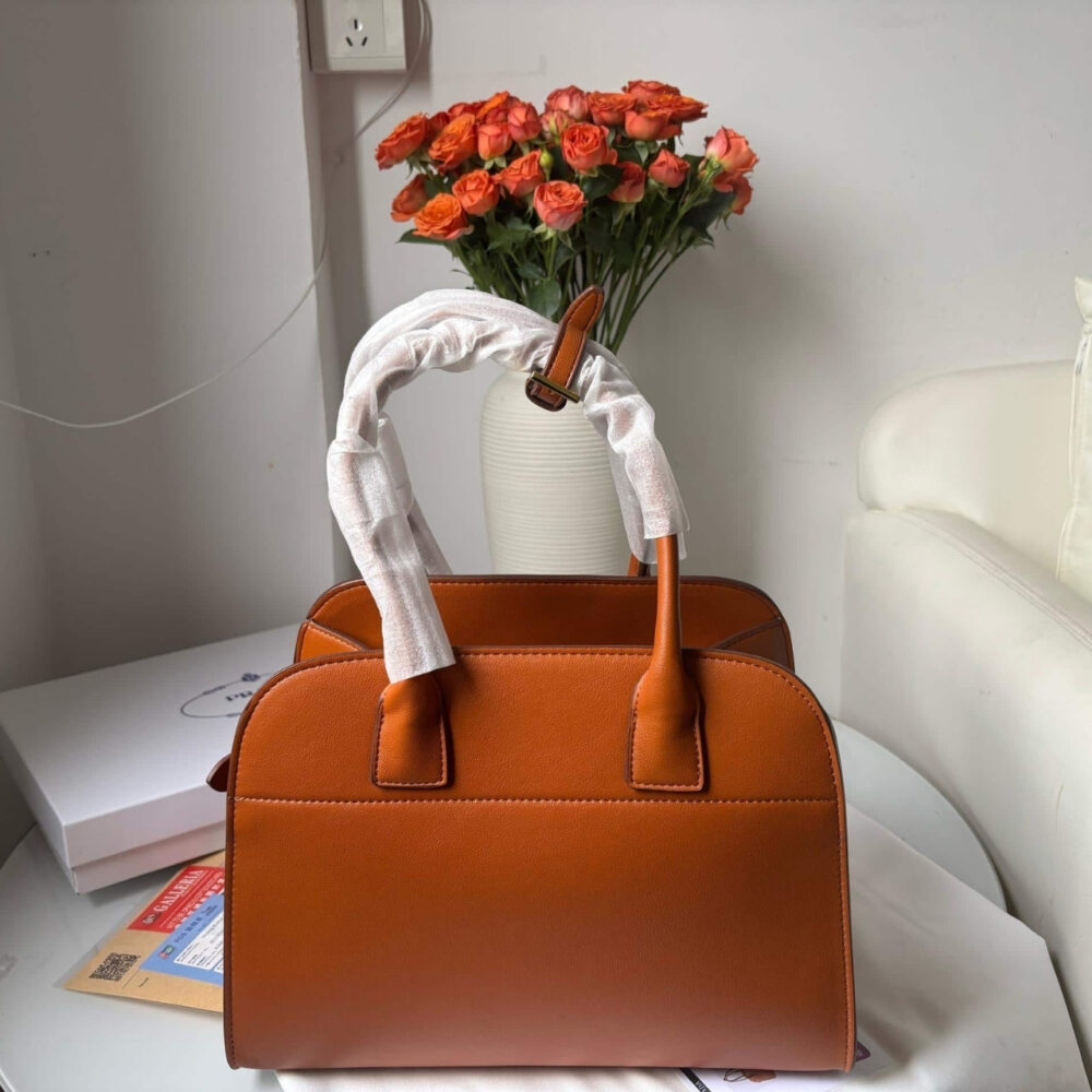 This is a structured top-handle bag from in a warm, elegant orange tone. Its clean lines and gently rounded silhouette give it a timeless, refined look, perfect for both professional and casual settings.